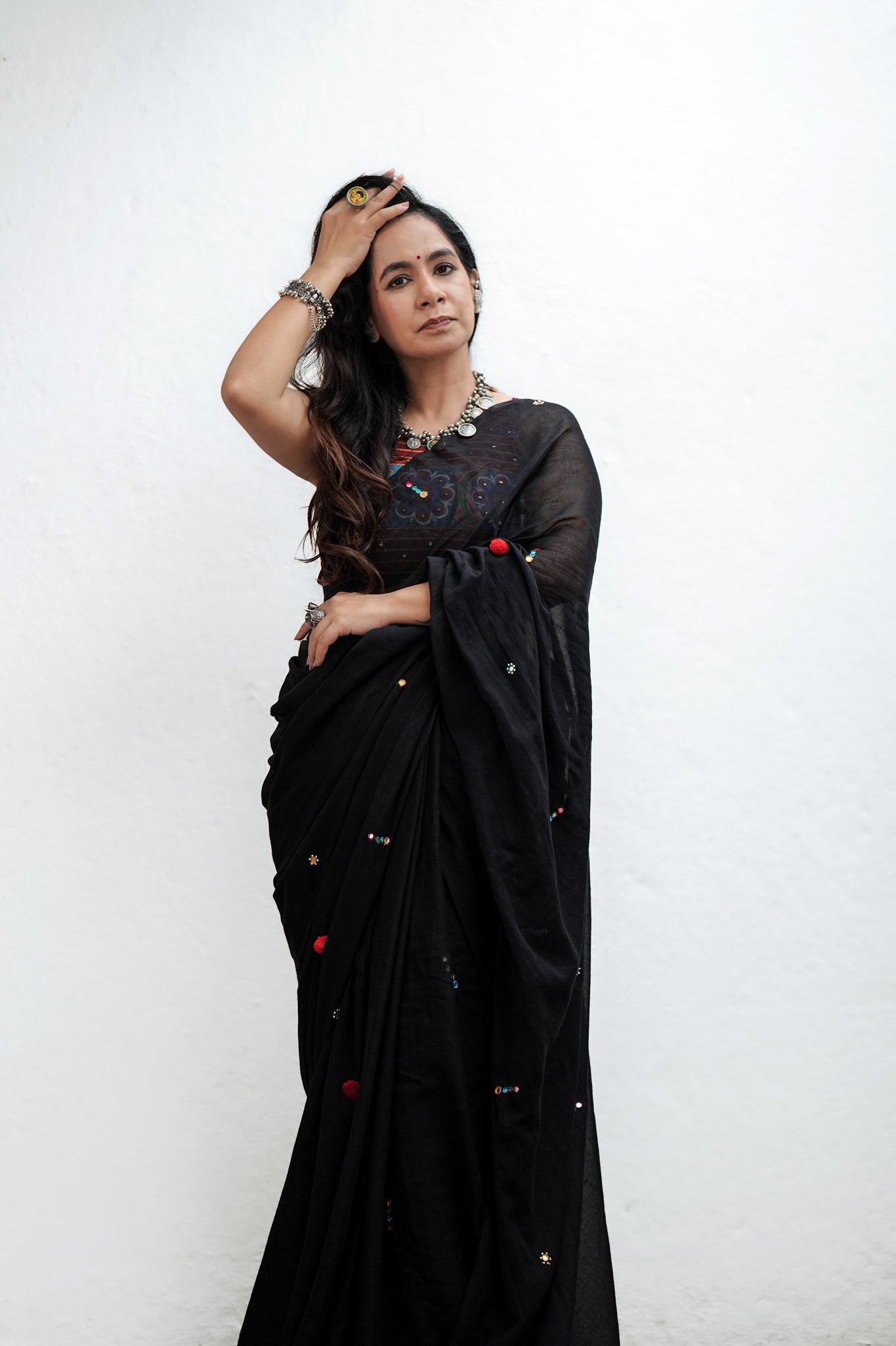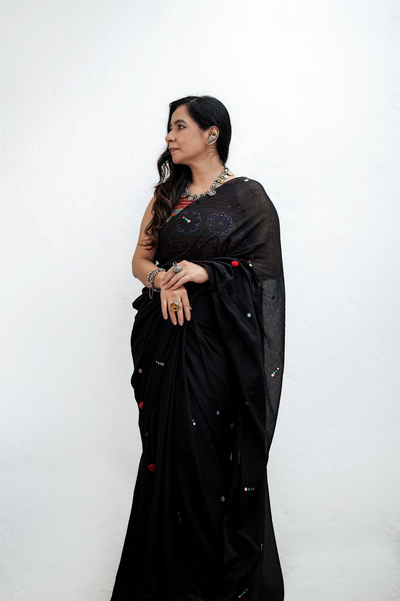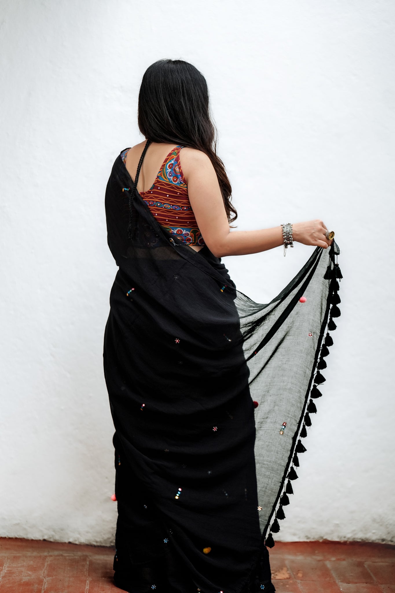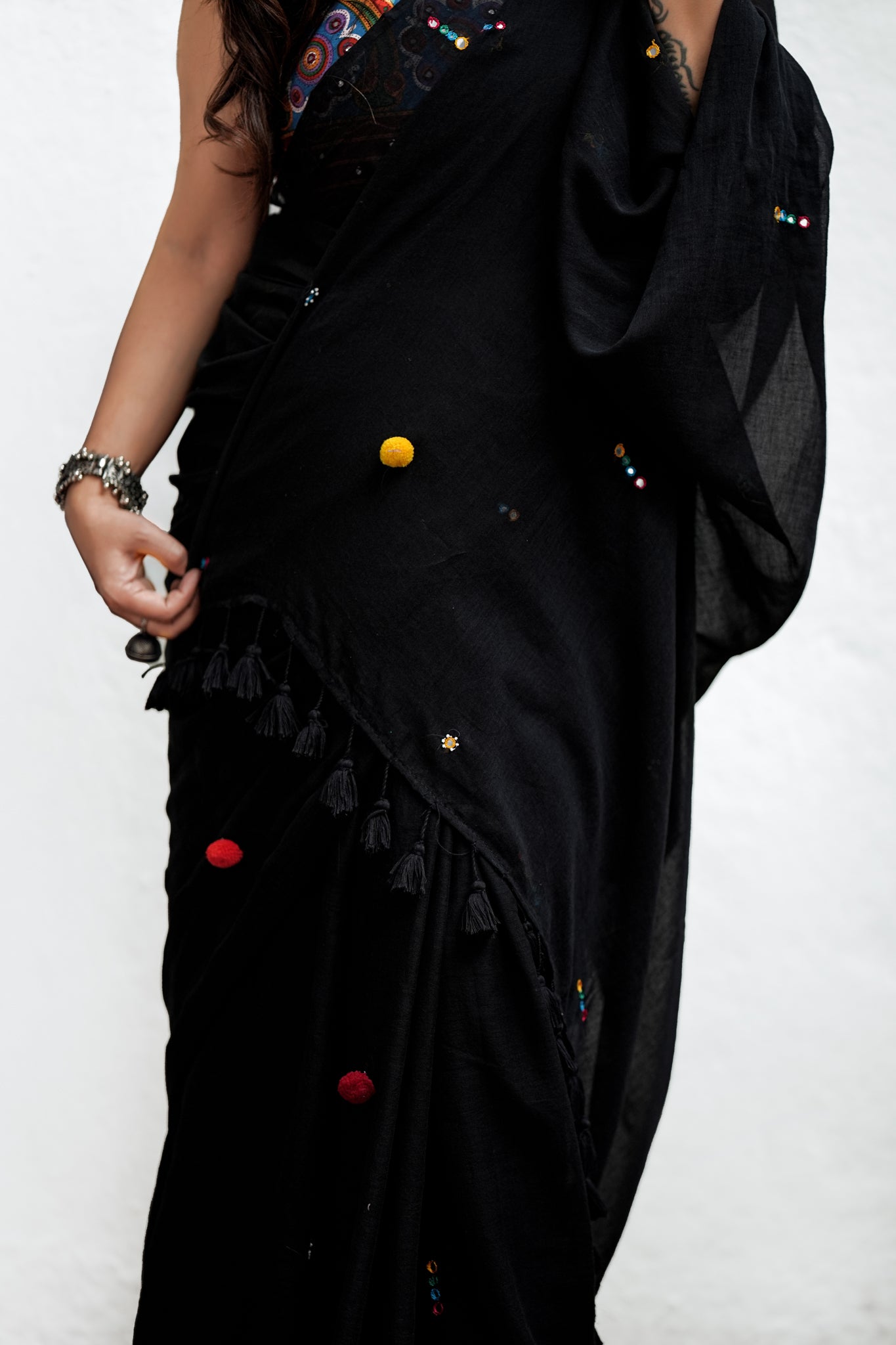 Mul Cotton Hand Mirror Work Black Boho Saree