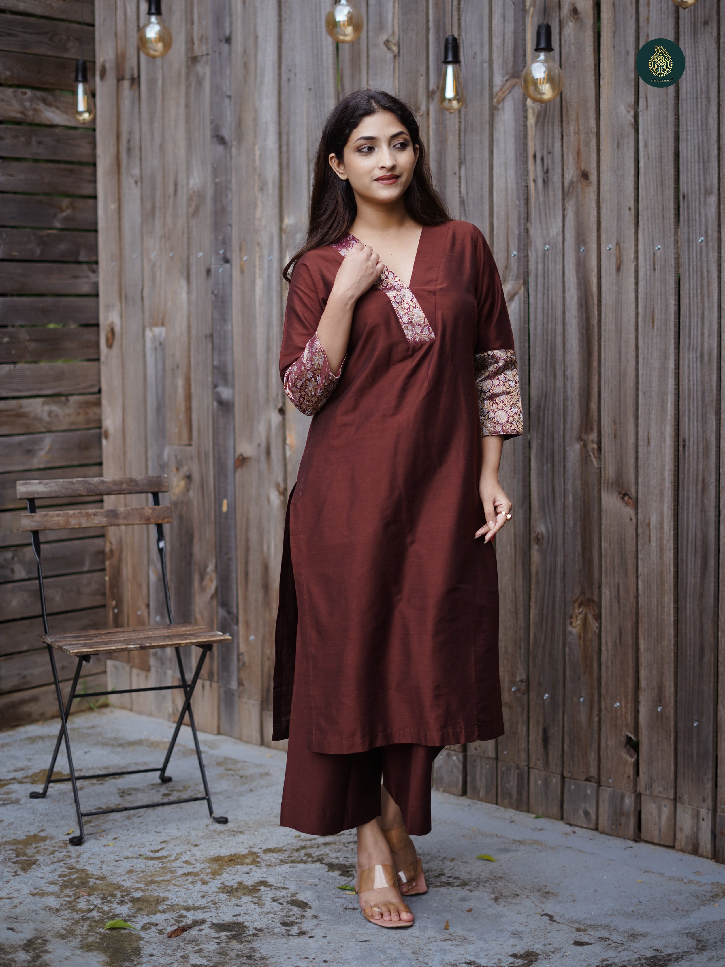 Stitched 2pc Cotton Silk Suit Set - Copper Brown