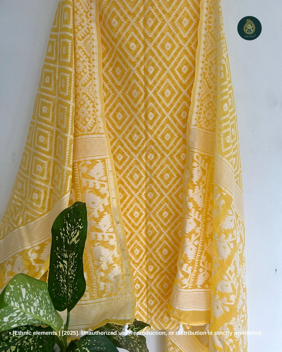 Graceful Jamdani Suit Set – A timeless ensemble featuring a kurta, dupatta, and bottoms fabric, crafted from pure, lightweight cotton for unmatched comfort and elegance. The kurta showcases intricate jaal work, adding a touch of tradition and sophistication. The bottoms come in a classic plain white for a balanced look.