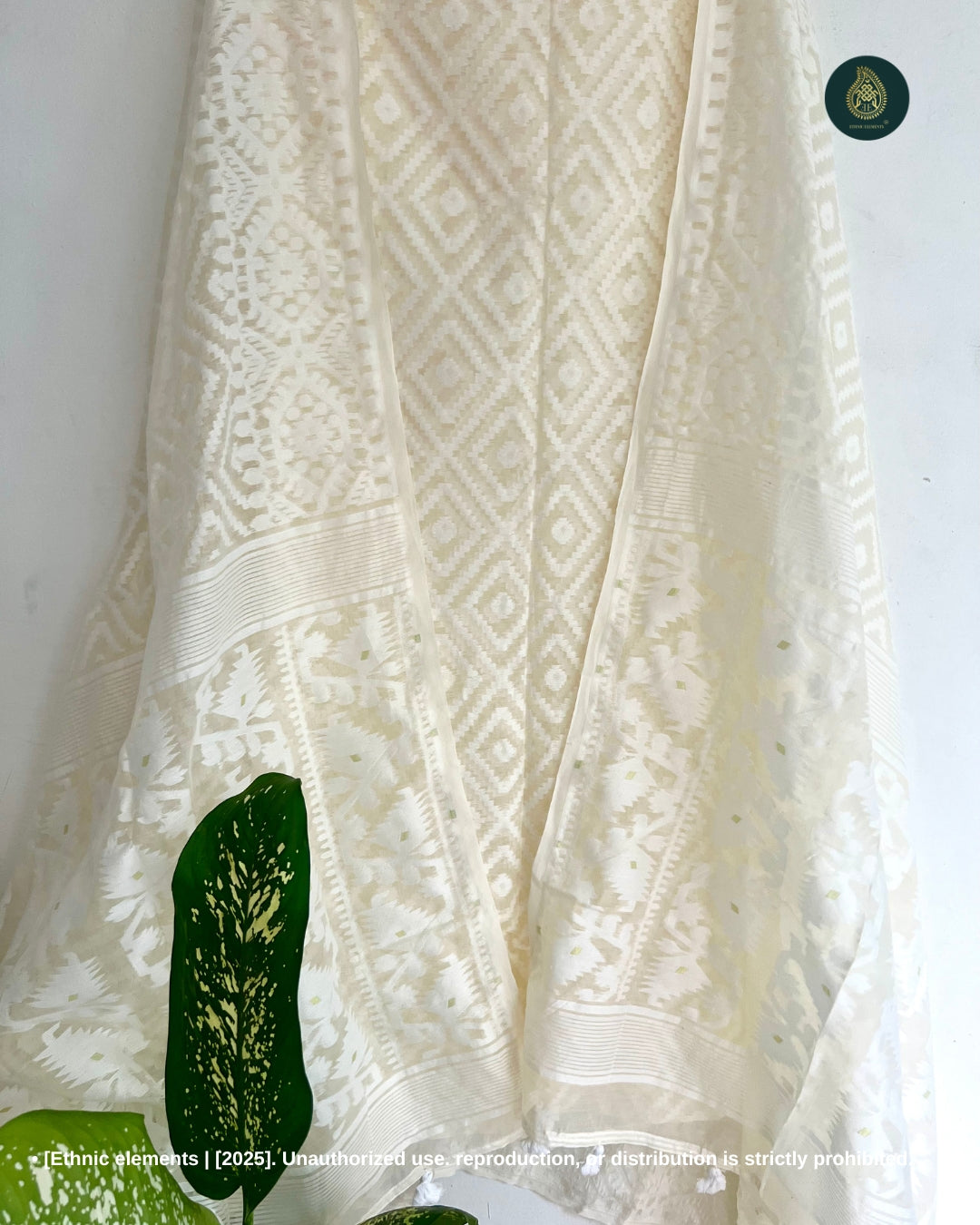 A masterpiece handcrafted by skilled rural artisans of India, preserving the rich tradition of Jamdani weaving.