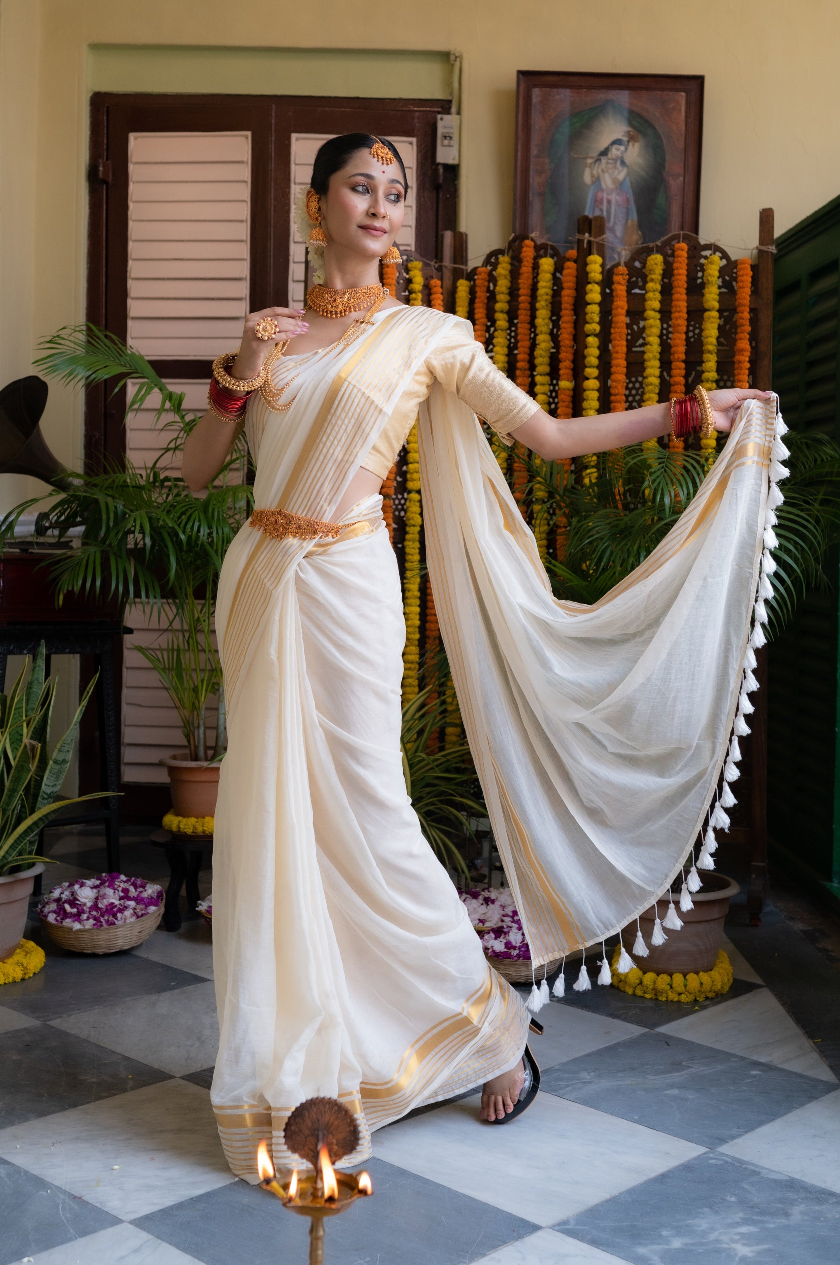The classic combination of white and gold reflects Kerala’s timeless tradition—making it a beautiful choice for Onam celebrations, intimate functions, or even minimalist weddings. Delicate handmade tassels on the pallu complete the saree with artisanal finesse.
