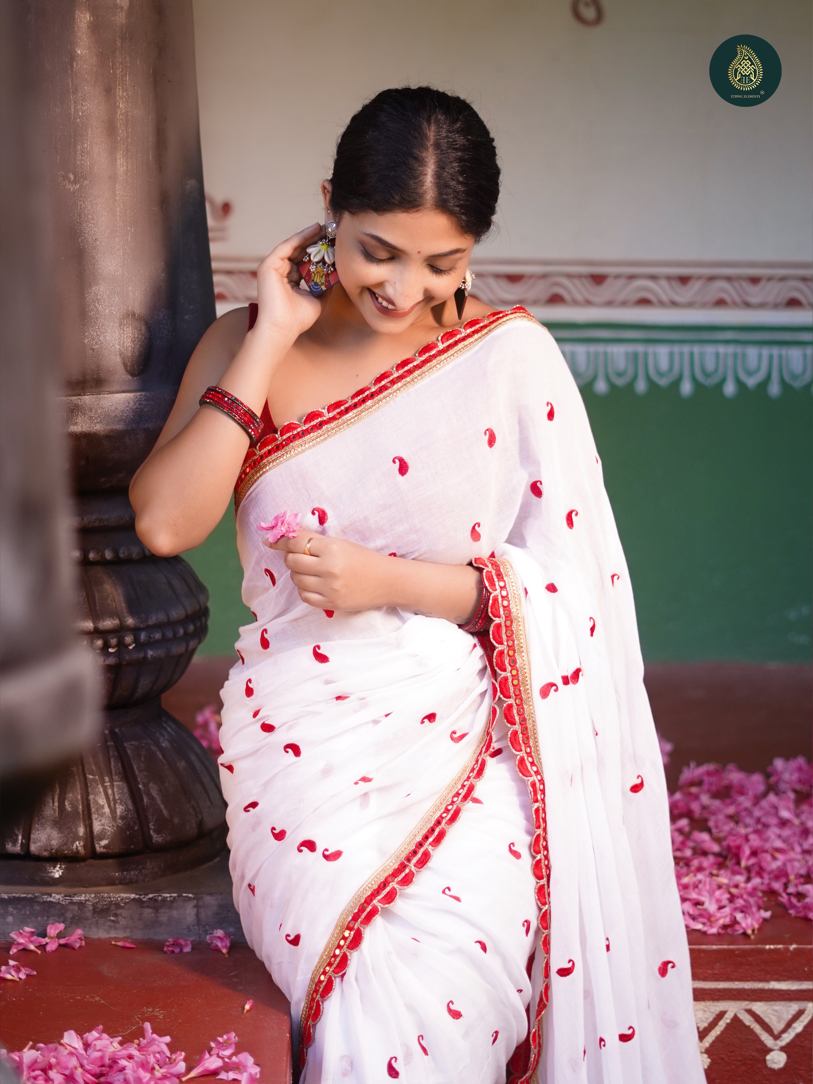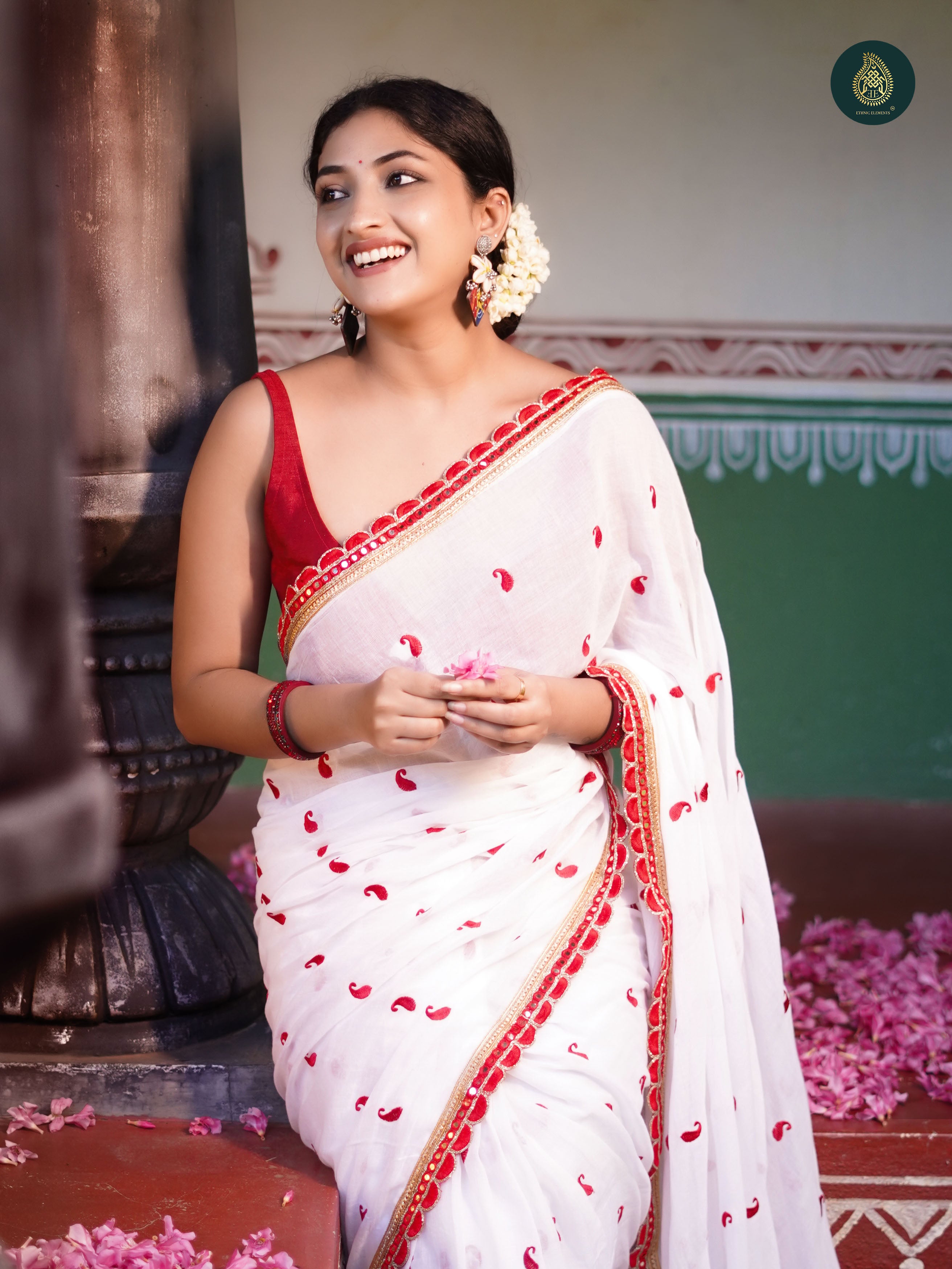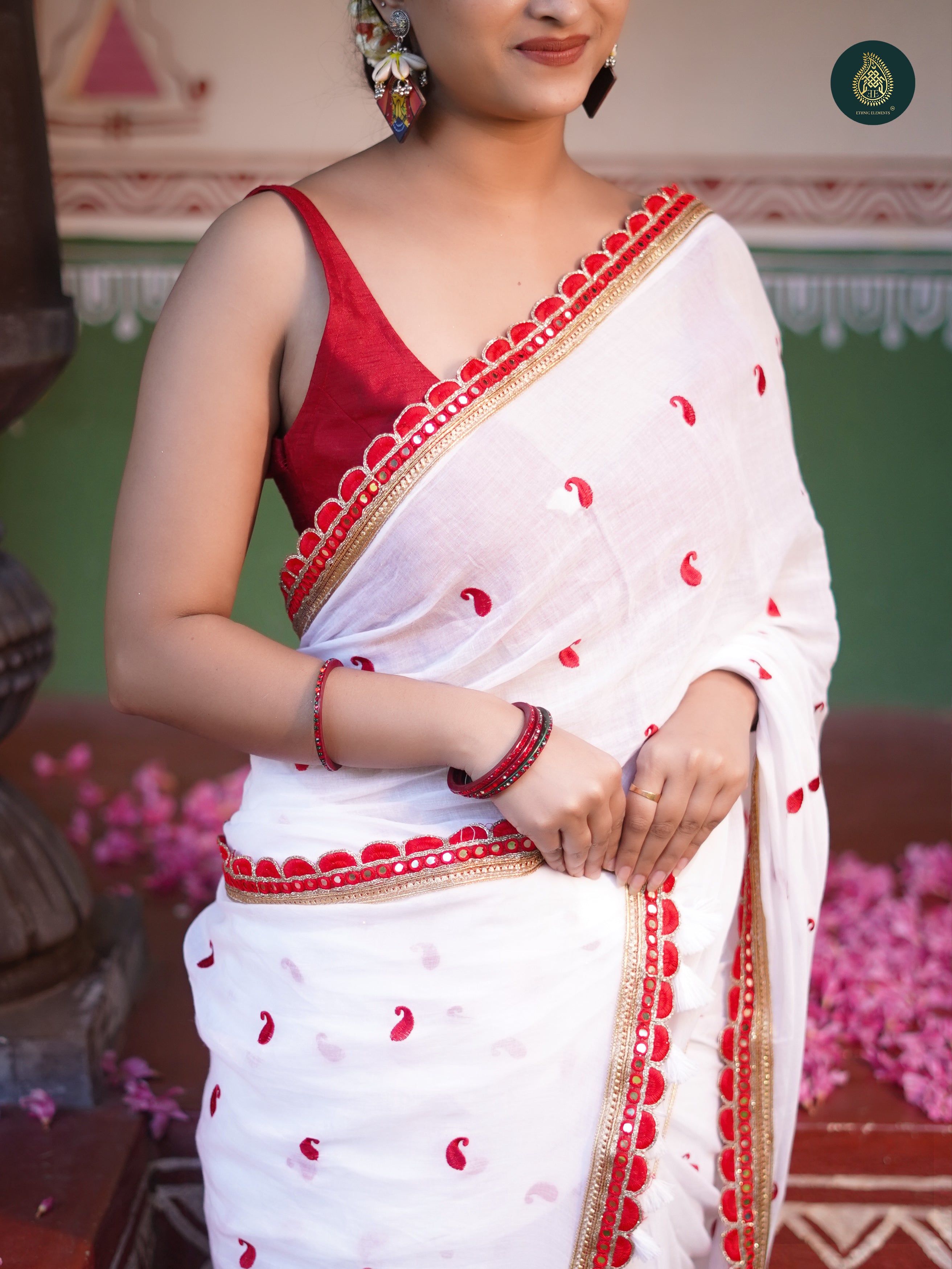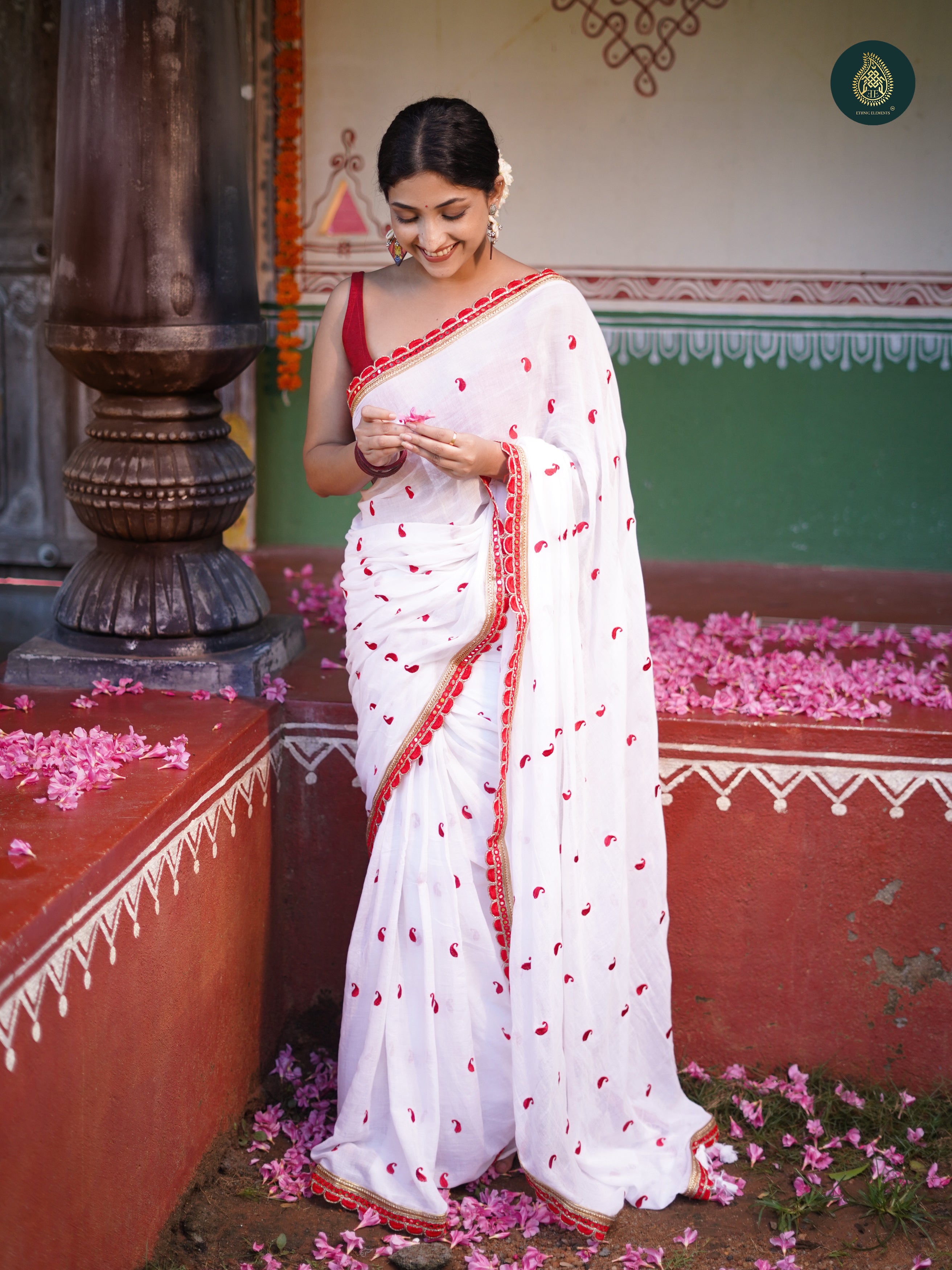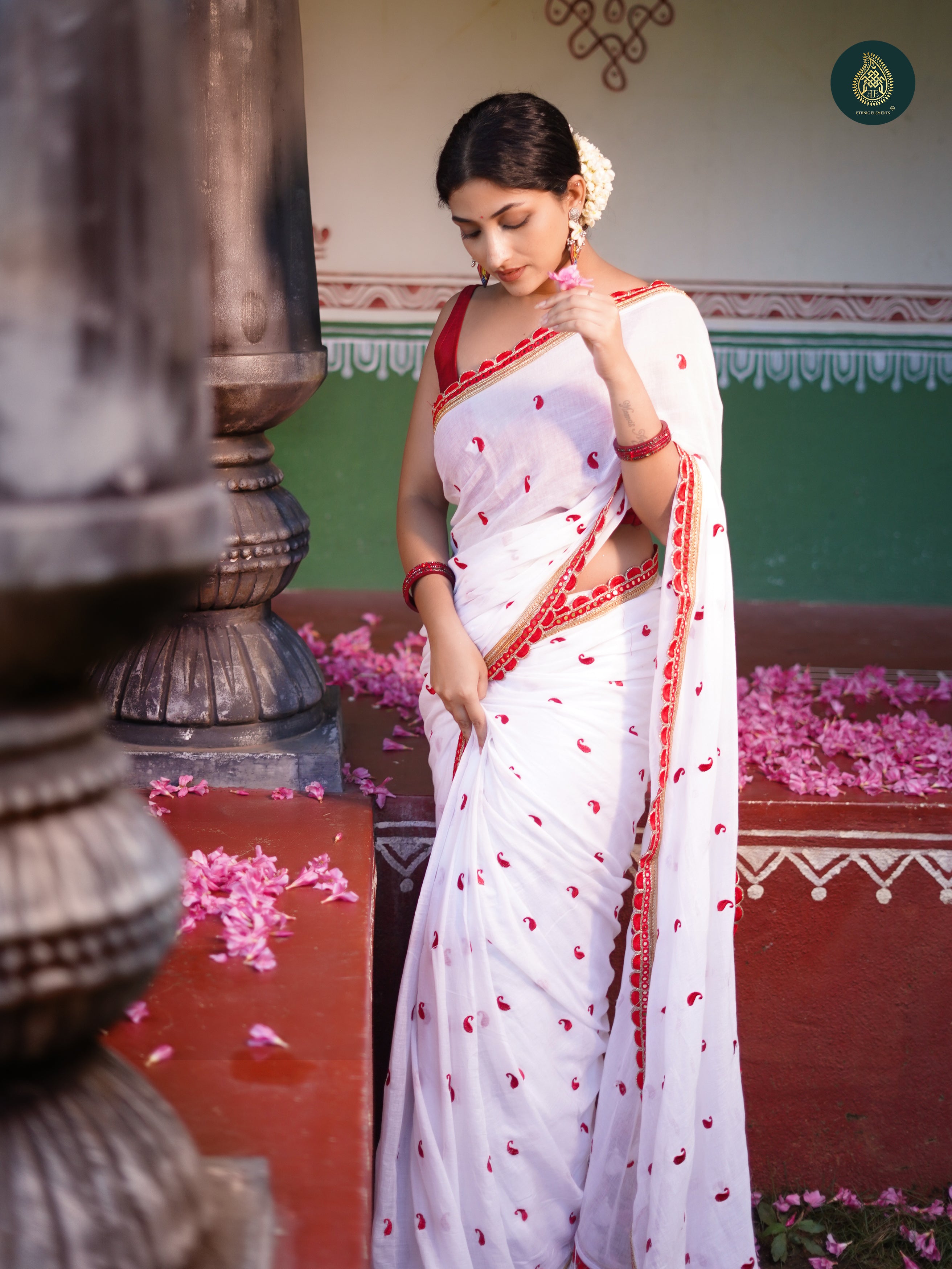 Explore our exquisite Pujo Saree collection crafted from pure fabrics with embroidered designs. Discover stunning designs of saree in white and red for Durga Puja. Plain saree is crafted with precision and adorned with handmade big tassels. Comes with a blouse piece. It is a beauty in making when timeless artistry meets modern grace.