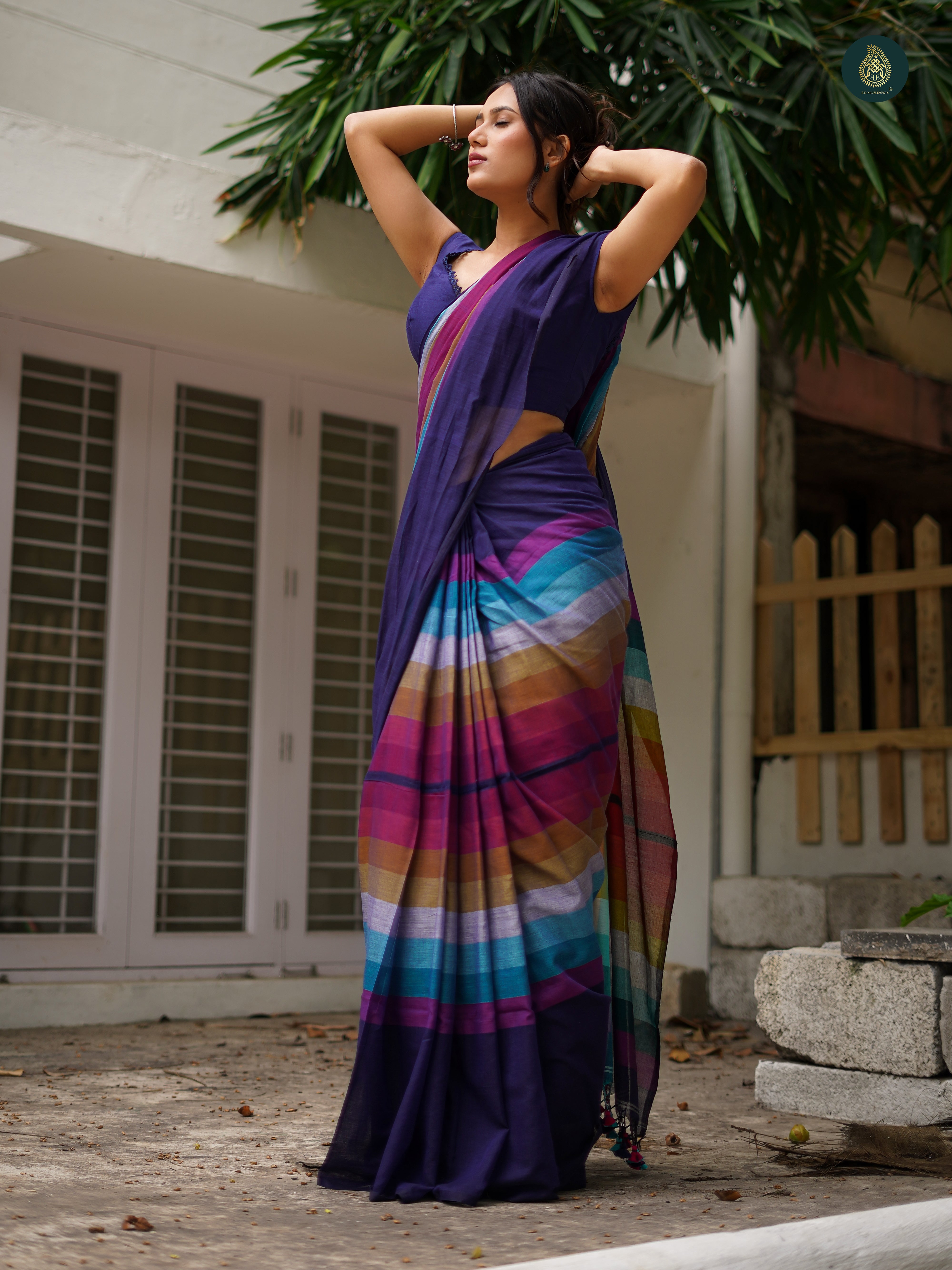 Pure mul cotton color block saree WITHOUT blouse. Handmade tassels on the pallu. Vibrant color and lightweight for easy to carry all day long. This saree is guaranteed to steal the show!