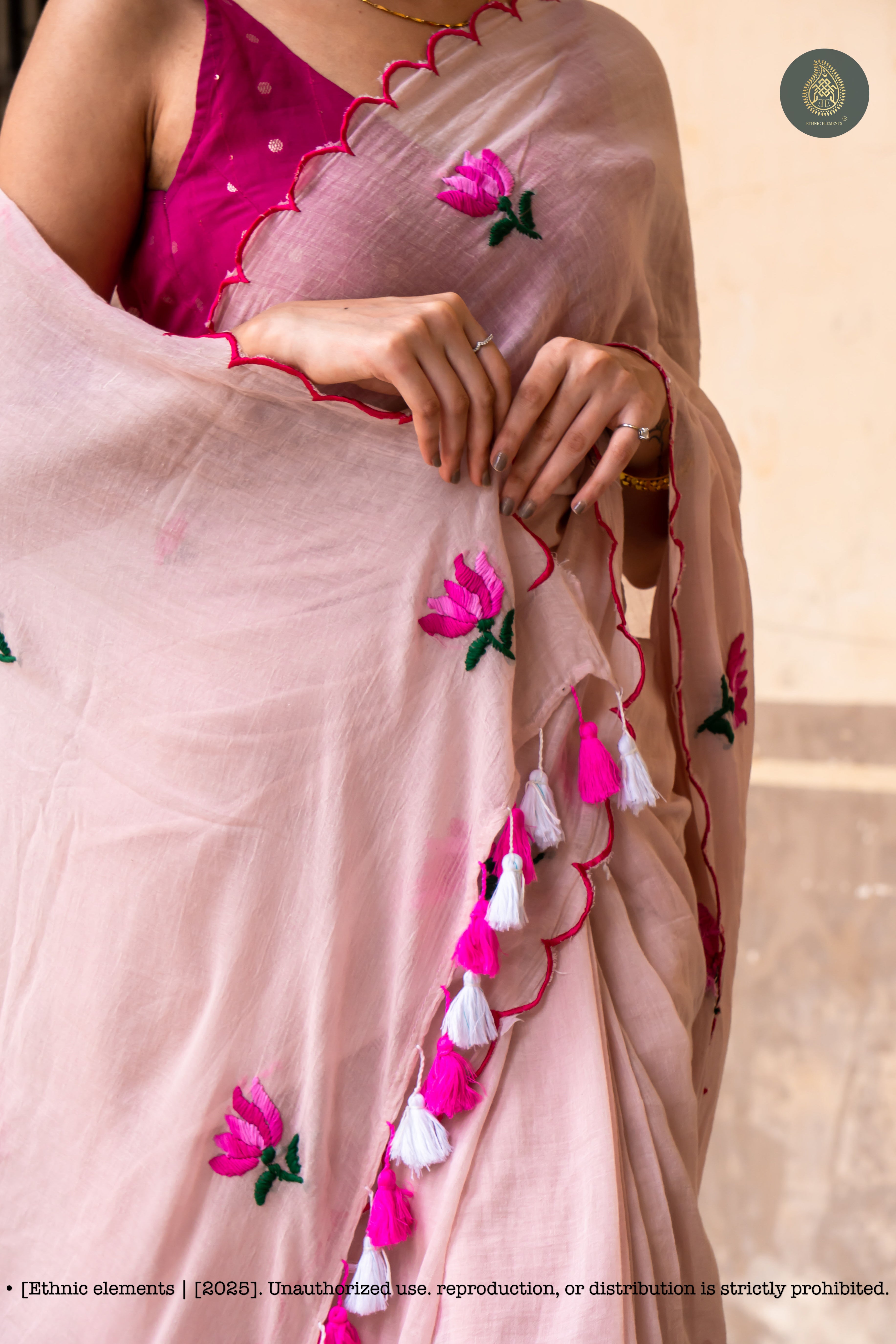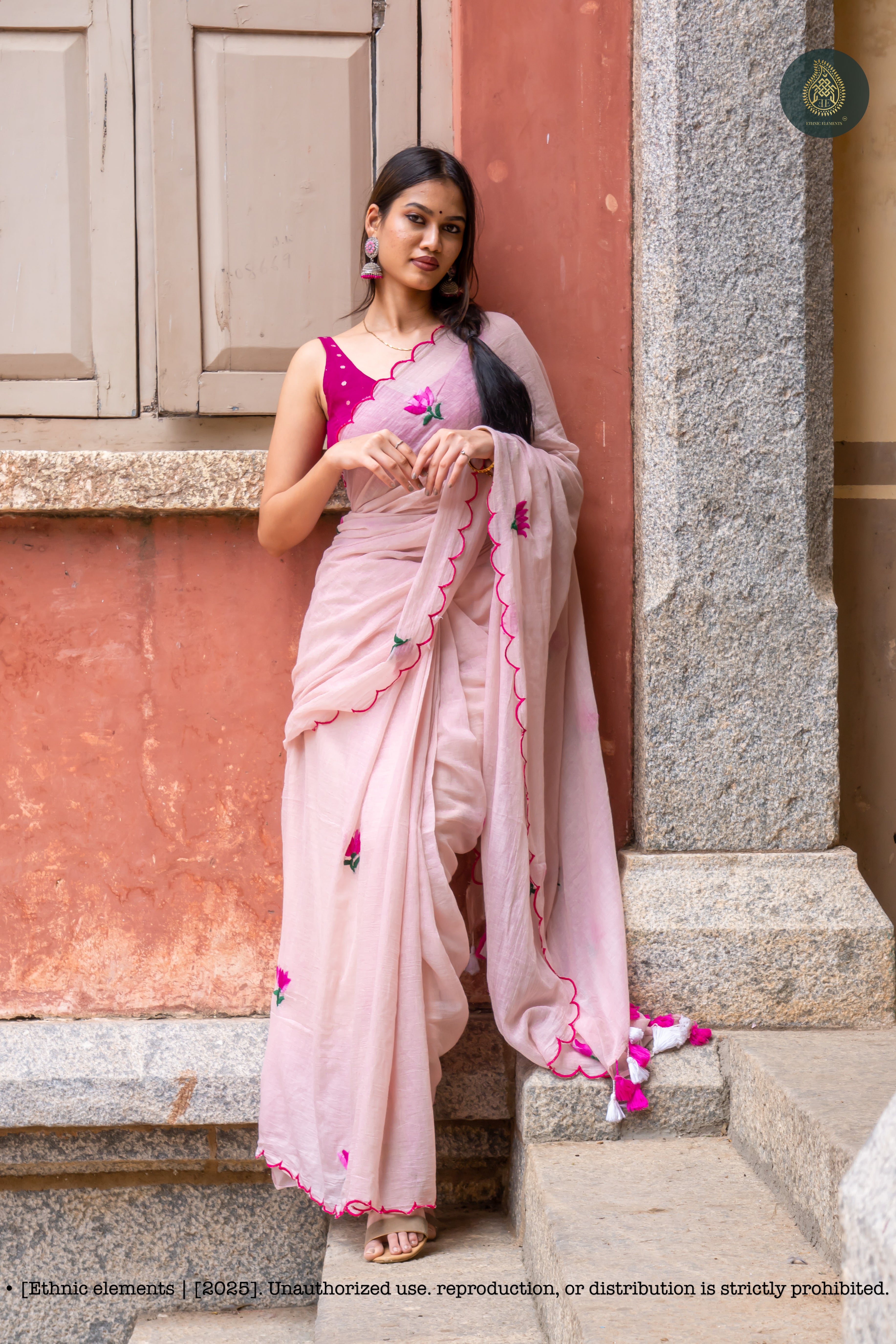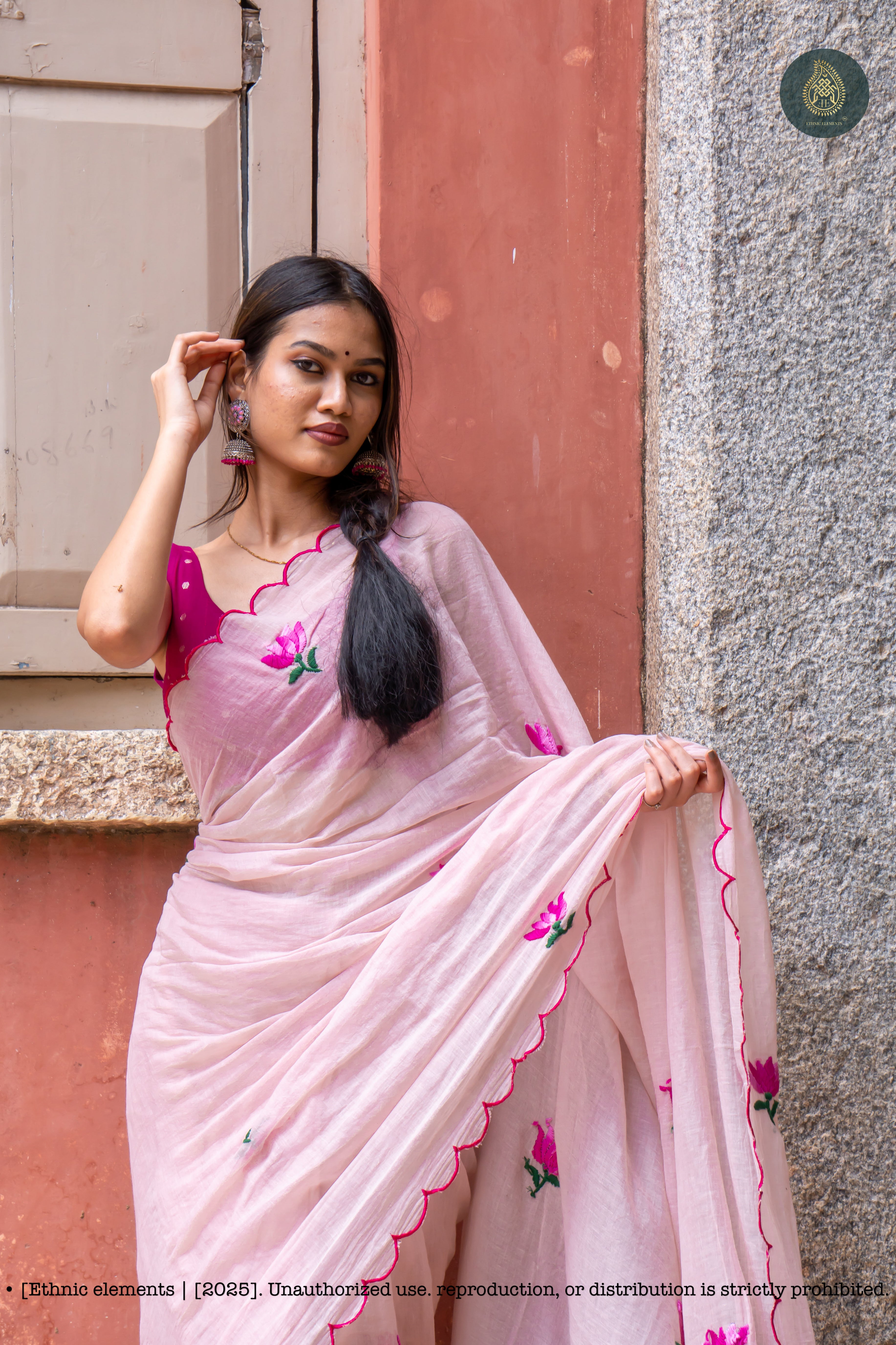 Mul Cotton Saree with Lotus Hand Embroidery Lotus Aura - Pink