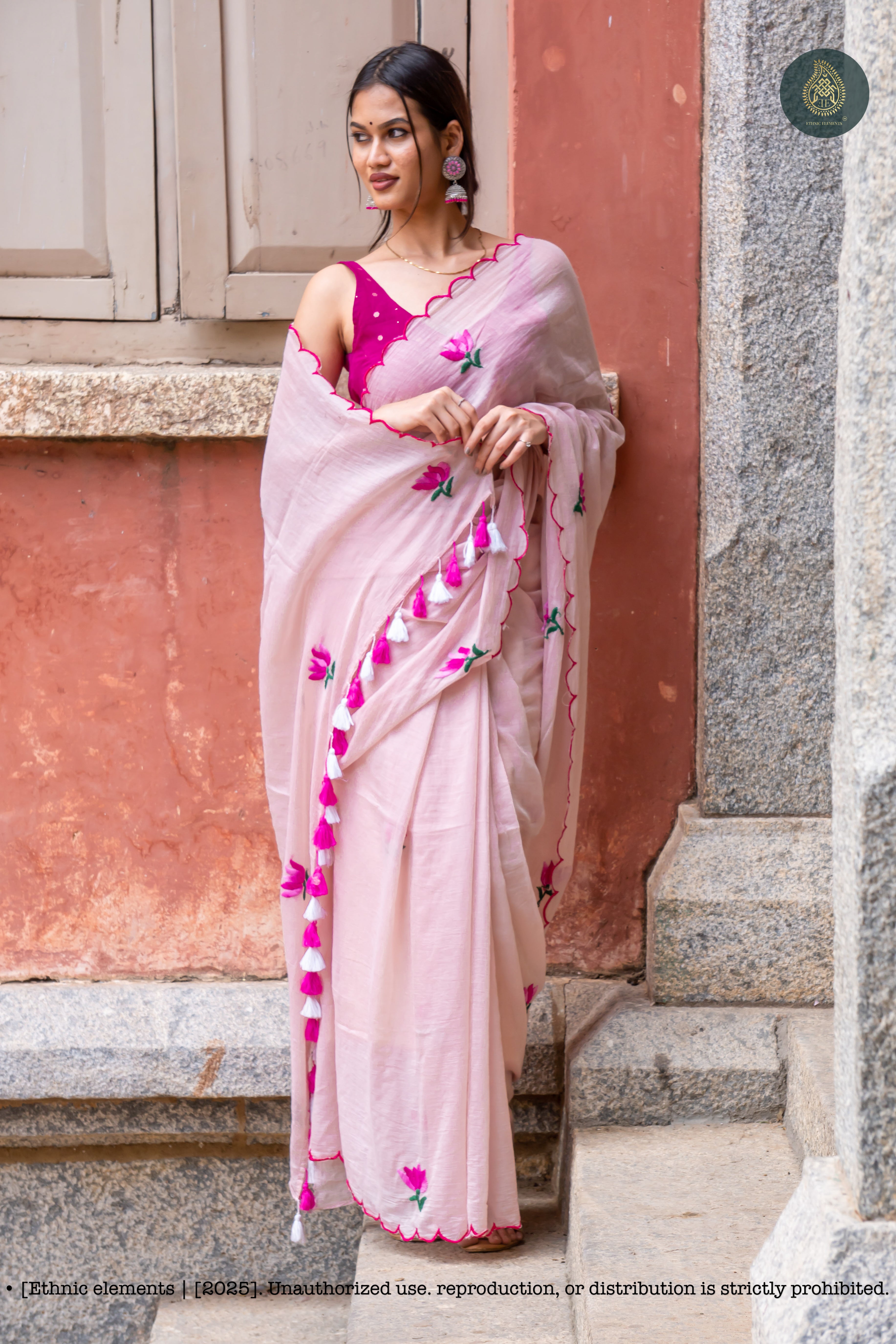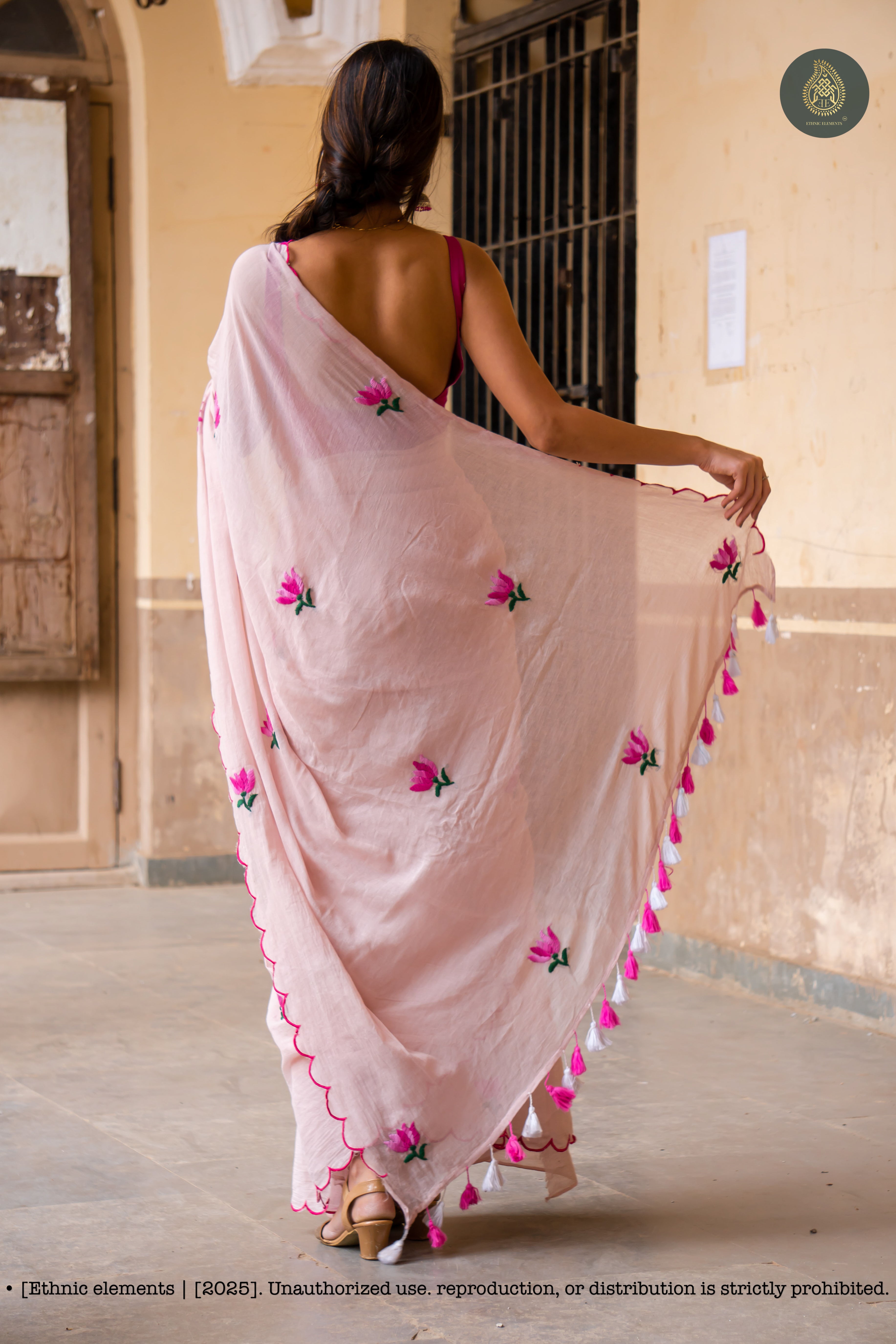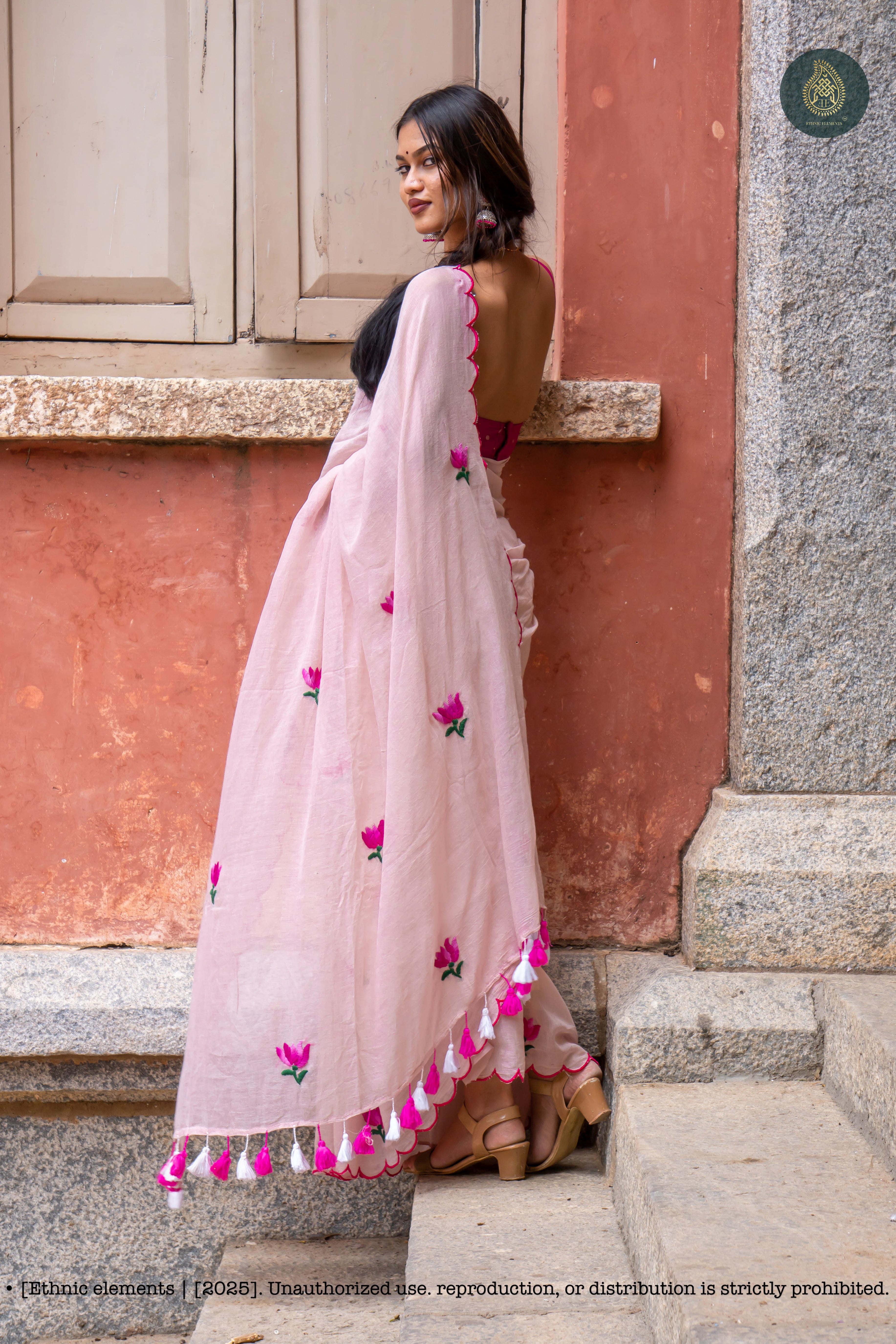 Mul Cotton Saree with Lotus Hand Embroidery Lotus Aura - Pink