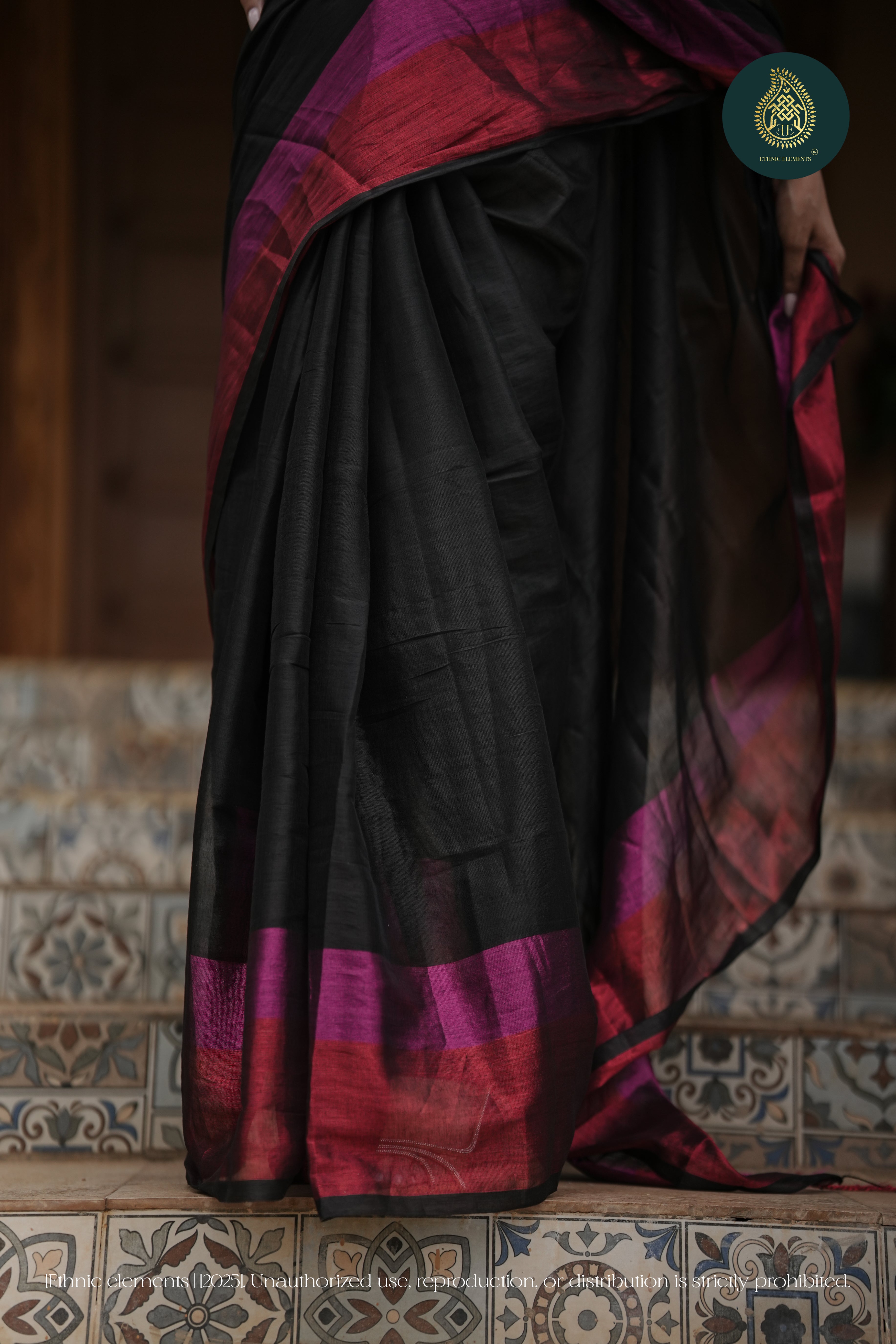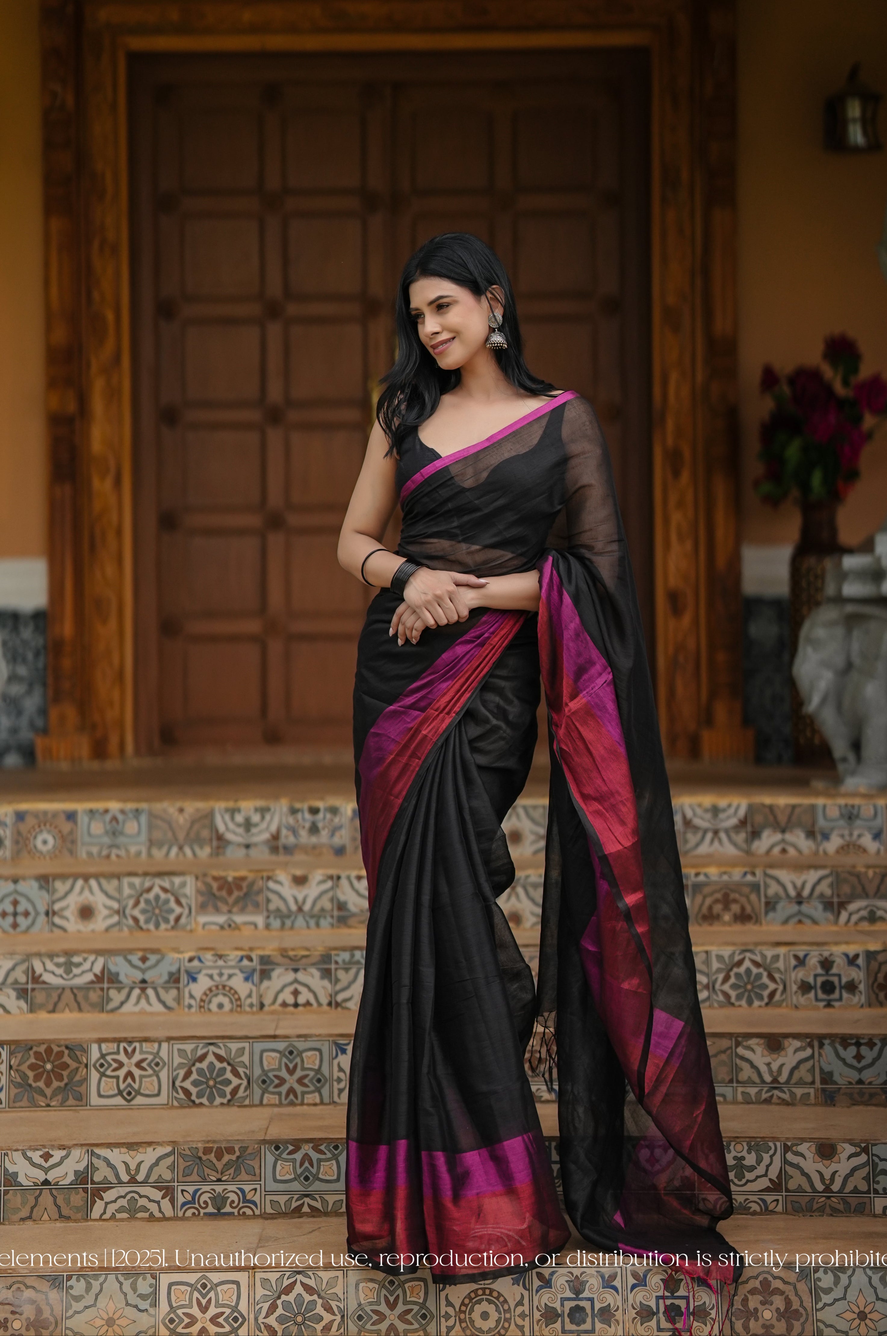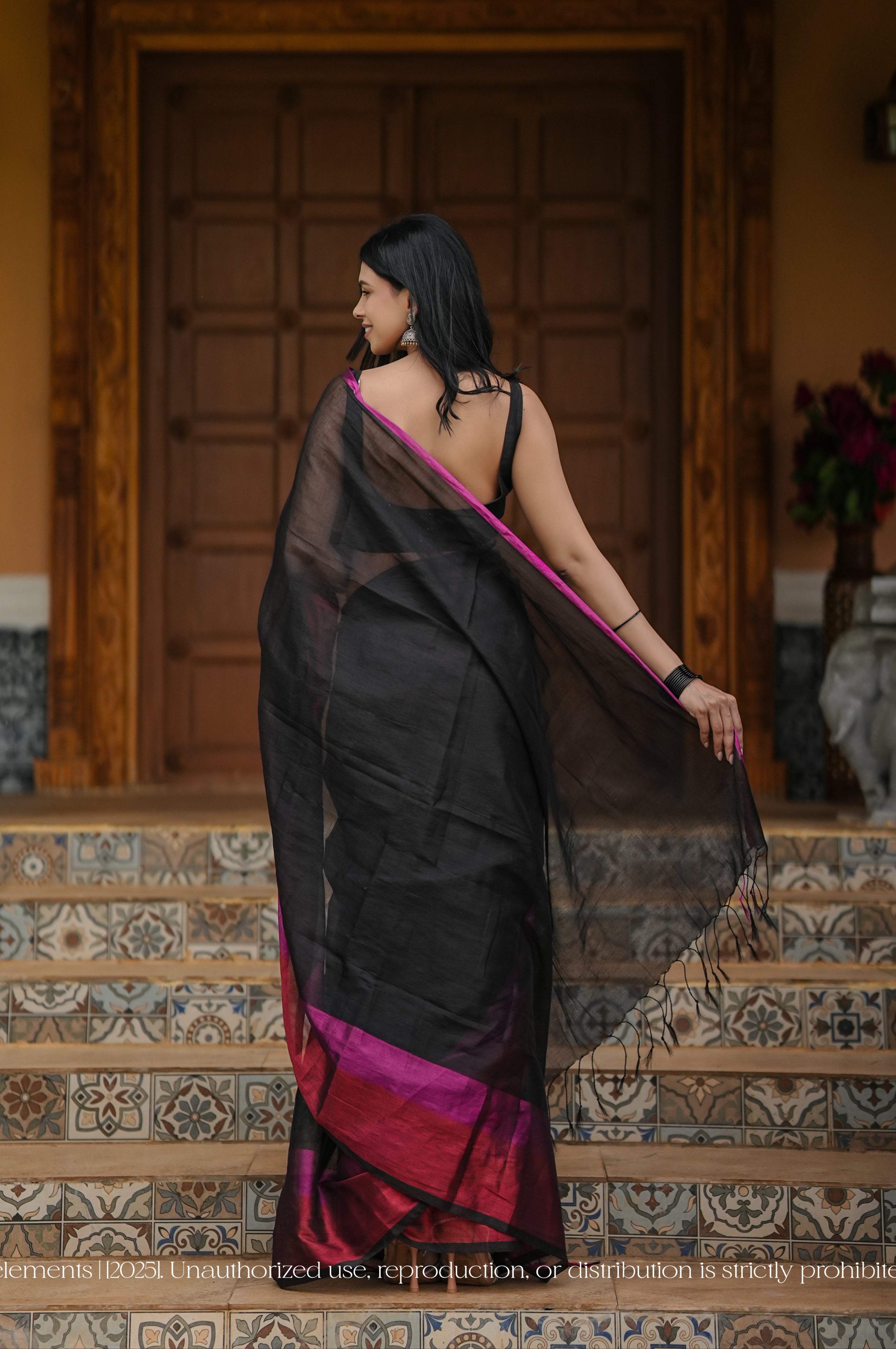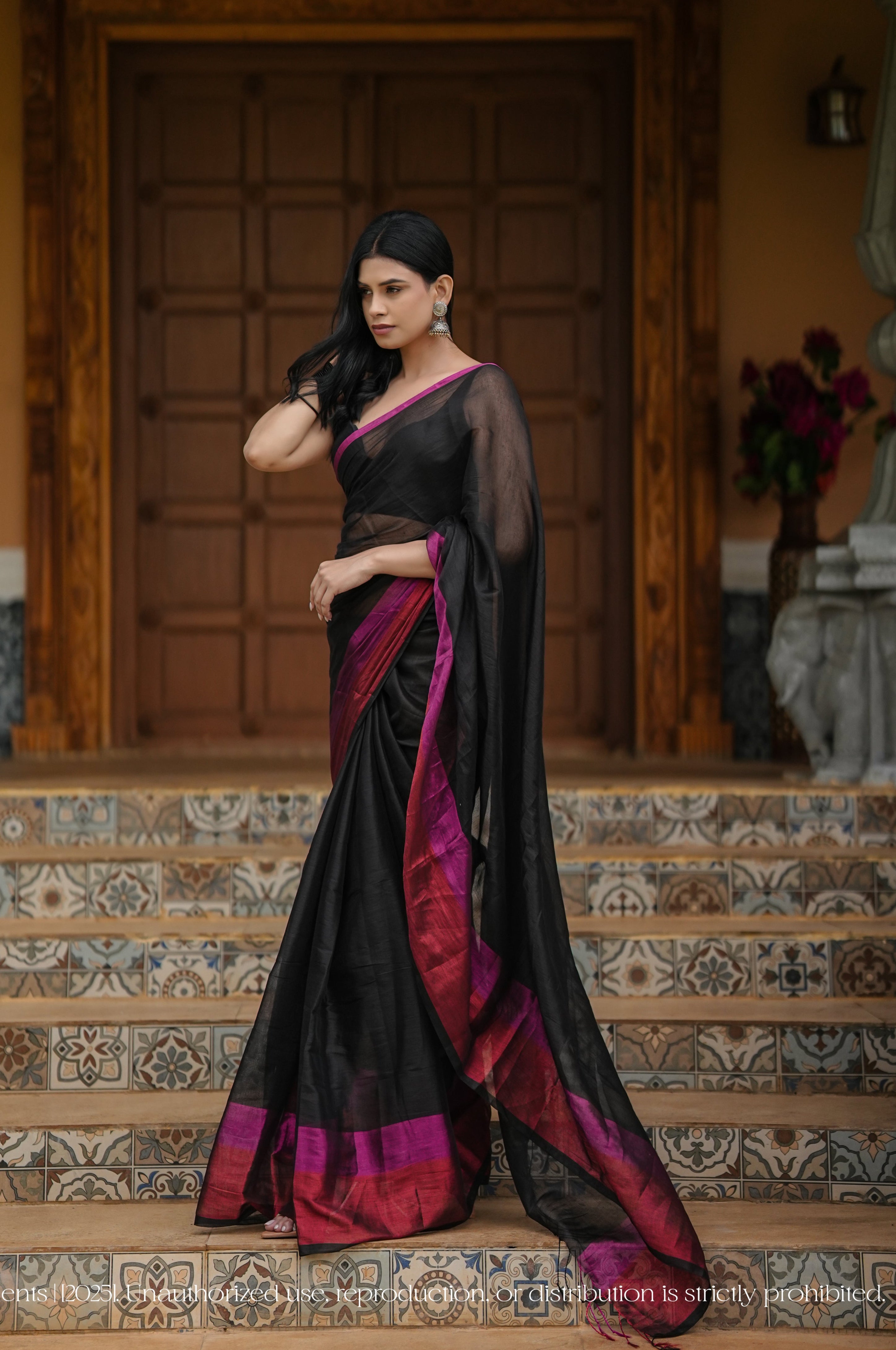 Mul Cotton Tissue Black Saree with Magenta-Red Border- Black Ember