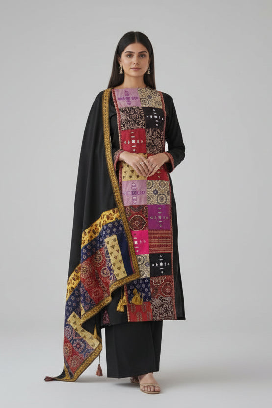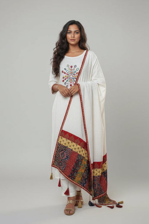 Assman - Kutchi Mirrow Kantha Cotton 3Pc Suit Set With Ajrakh Patchwork Dupatta