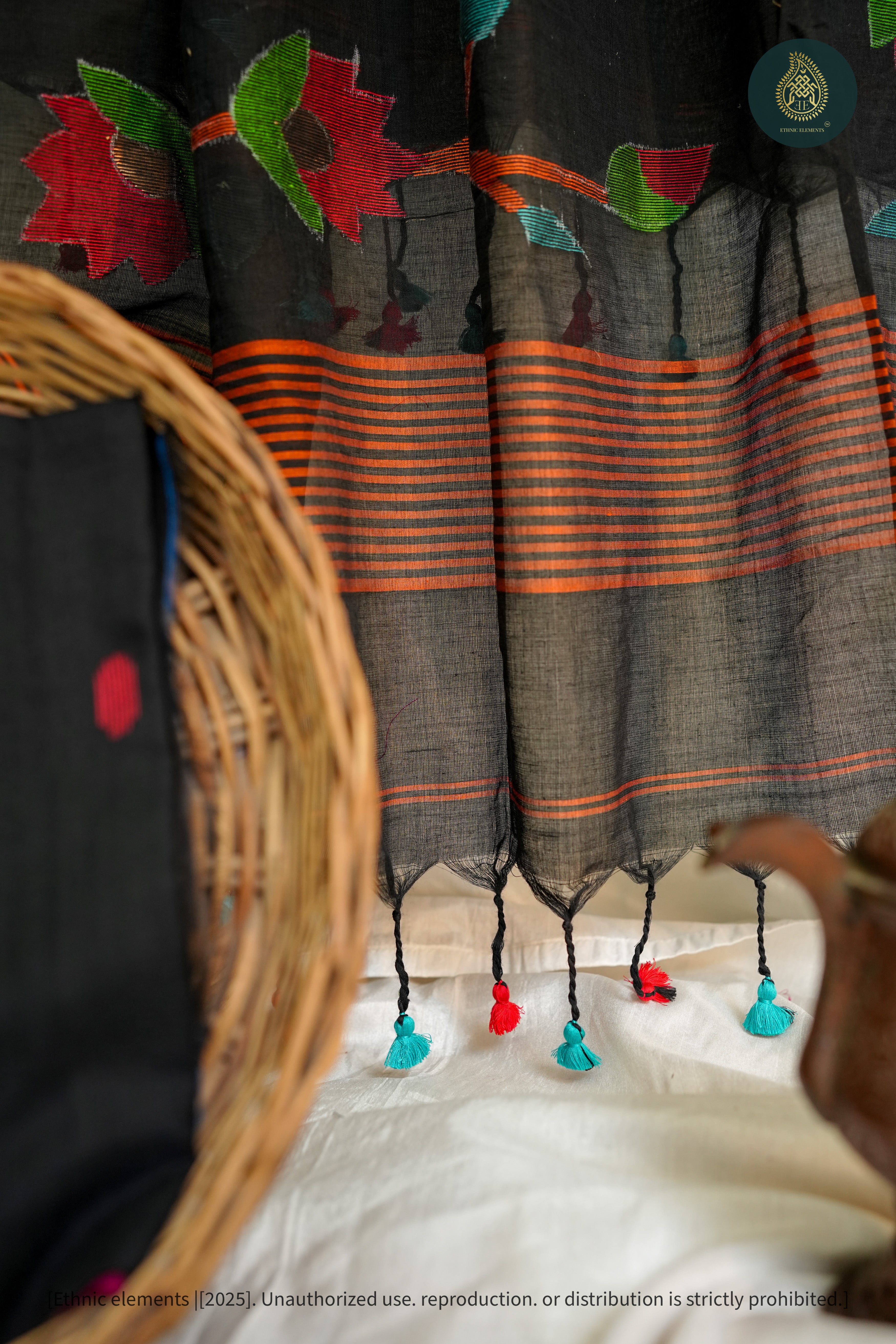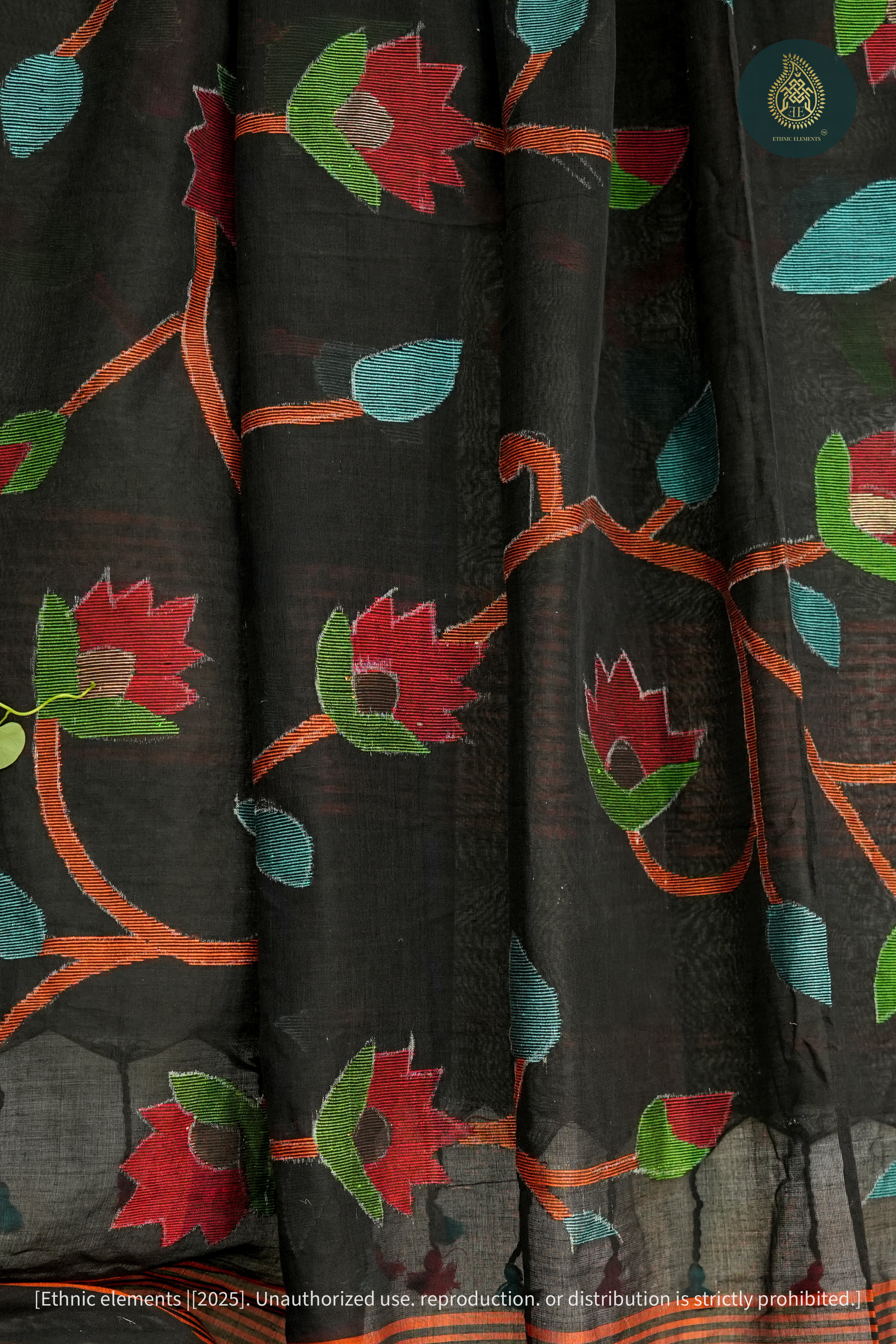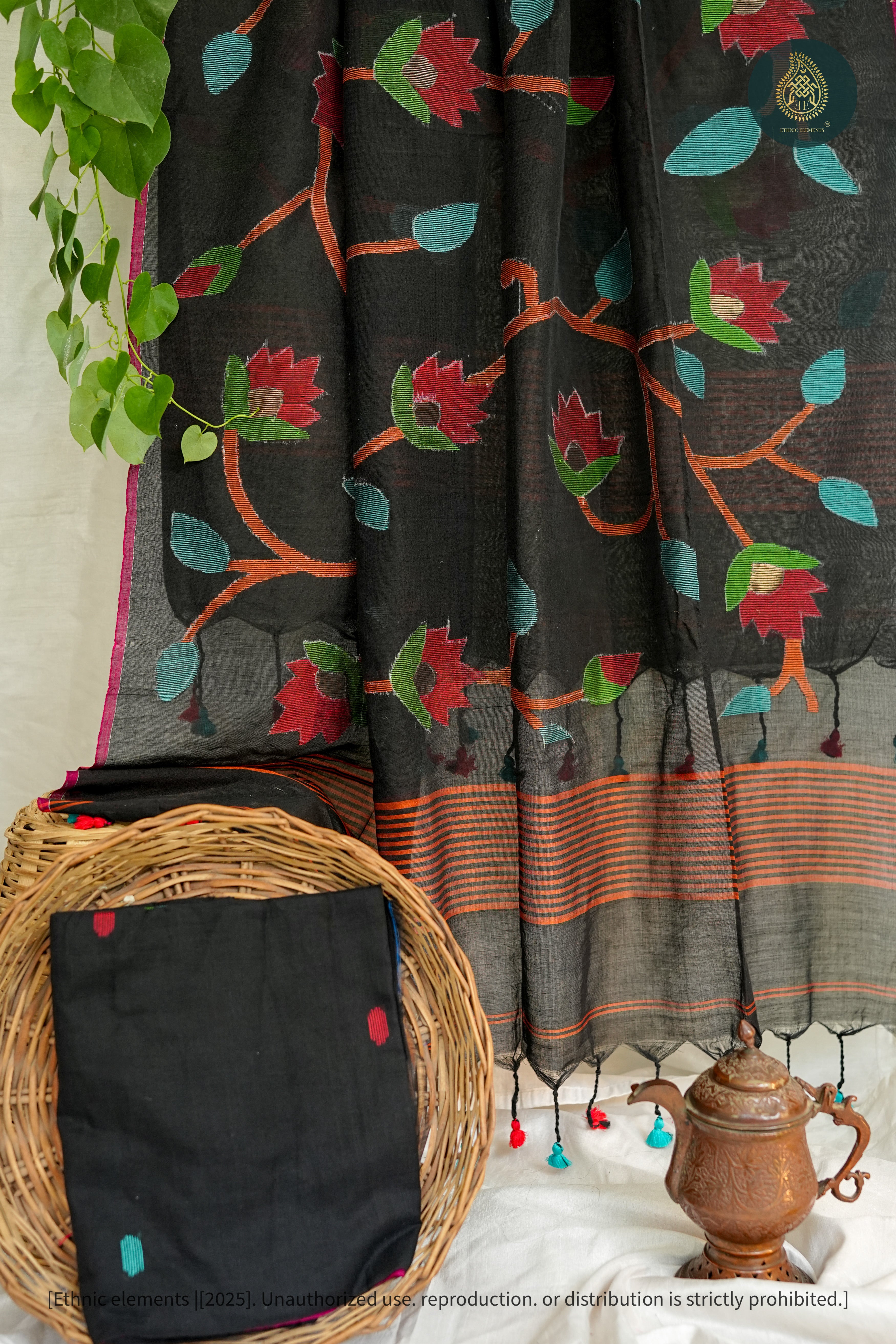 Immerse yourself in the timeless beauty of handloom craftsmanship with our Jamdani Cotton Suit Set. This piece ensemble is meticulously handwoven on traditional looms, showcasing intricate floral and Jamdani motifs in shades of terracotta.Crafted with exquisite craftsmanship, this unstitched Jamdani suit set celebrates the heritage of handloom weaving. The soft premium cotton fabric is adorned with intricate needle Jamdani work featuring delicate motifs, adding a touch of artistry and grace to your ensemble. Each piece is meticulously handwoven by skilled artisans, offering a perfect blend of comfort, culture, and timeless elegance.