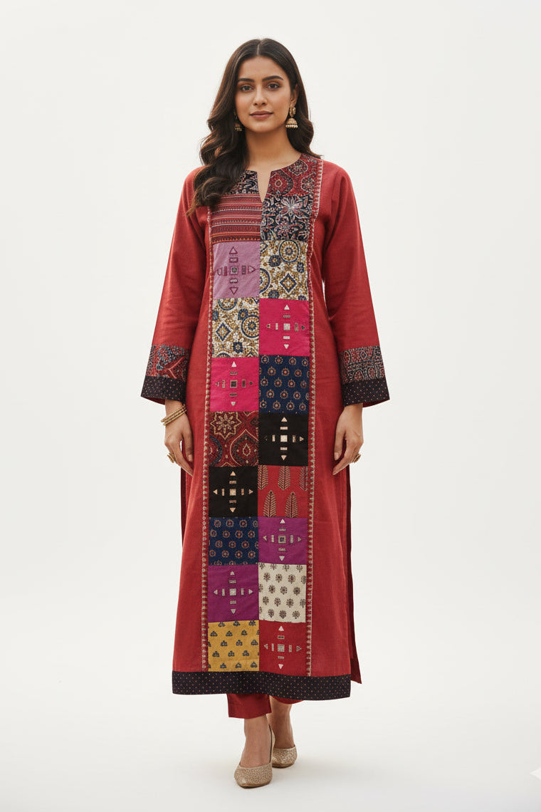 Discover the beauty of Indian handloom traditions with our Ajrakh Patchwork Cotton Suit Set, handcrafted using authentic Ajrakh hand block printed fabrics from Kutch, Gujarat. Designed for lovers of sustainable and ethnic fashion, this suit set showcases traditional geometric motifs created with natural dyes and meticulous patchwork detailing.