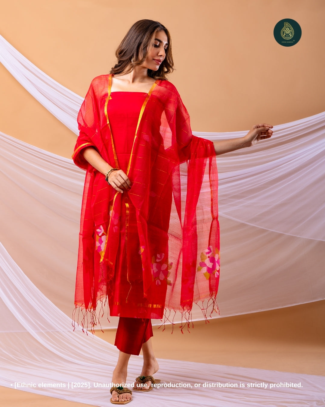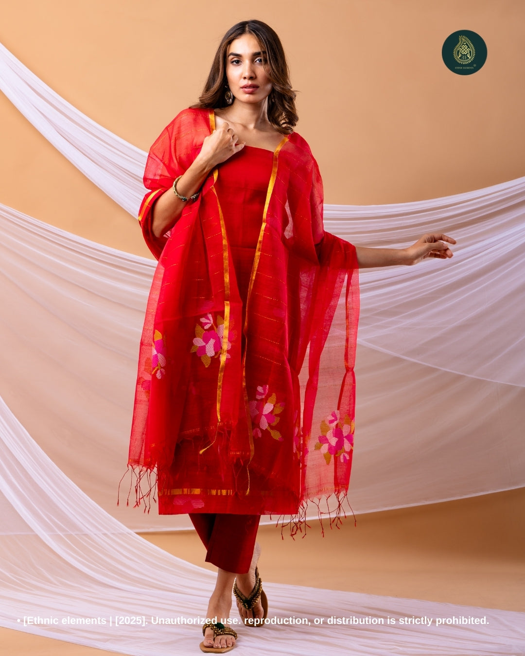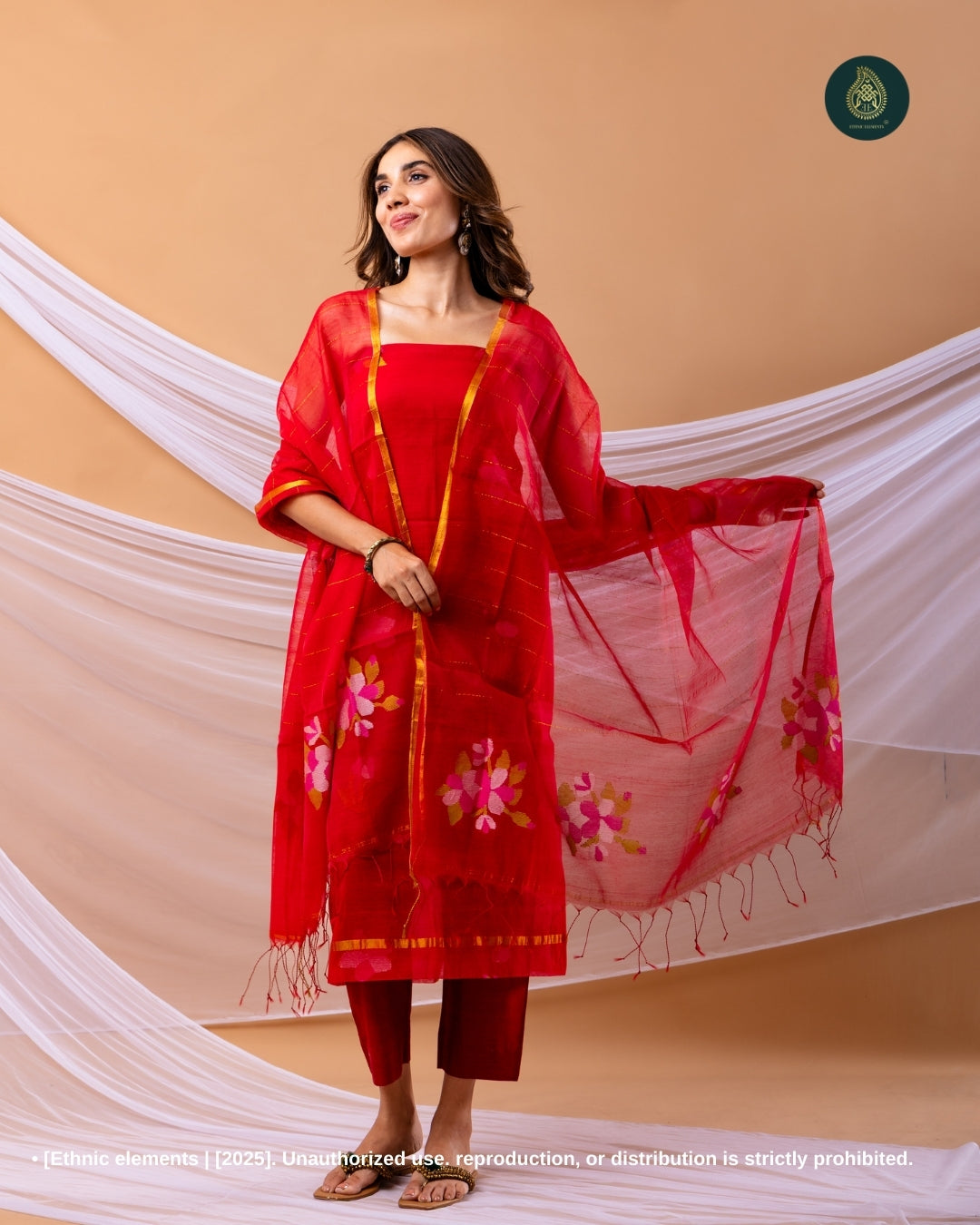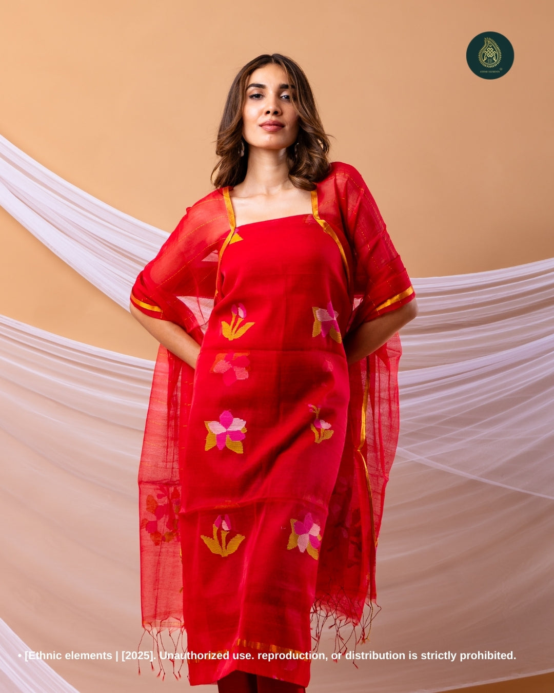 Resham Muslin Jamdani Suit Set - Sindhoor Red