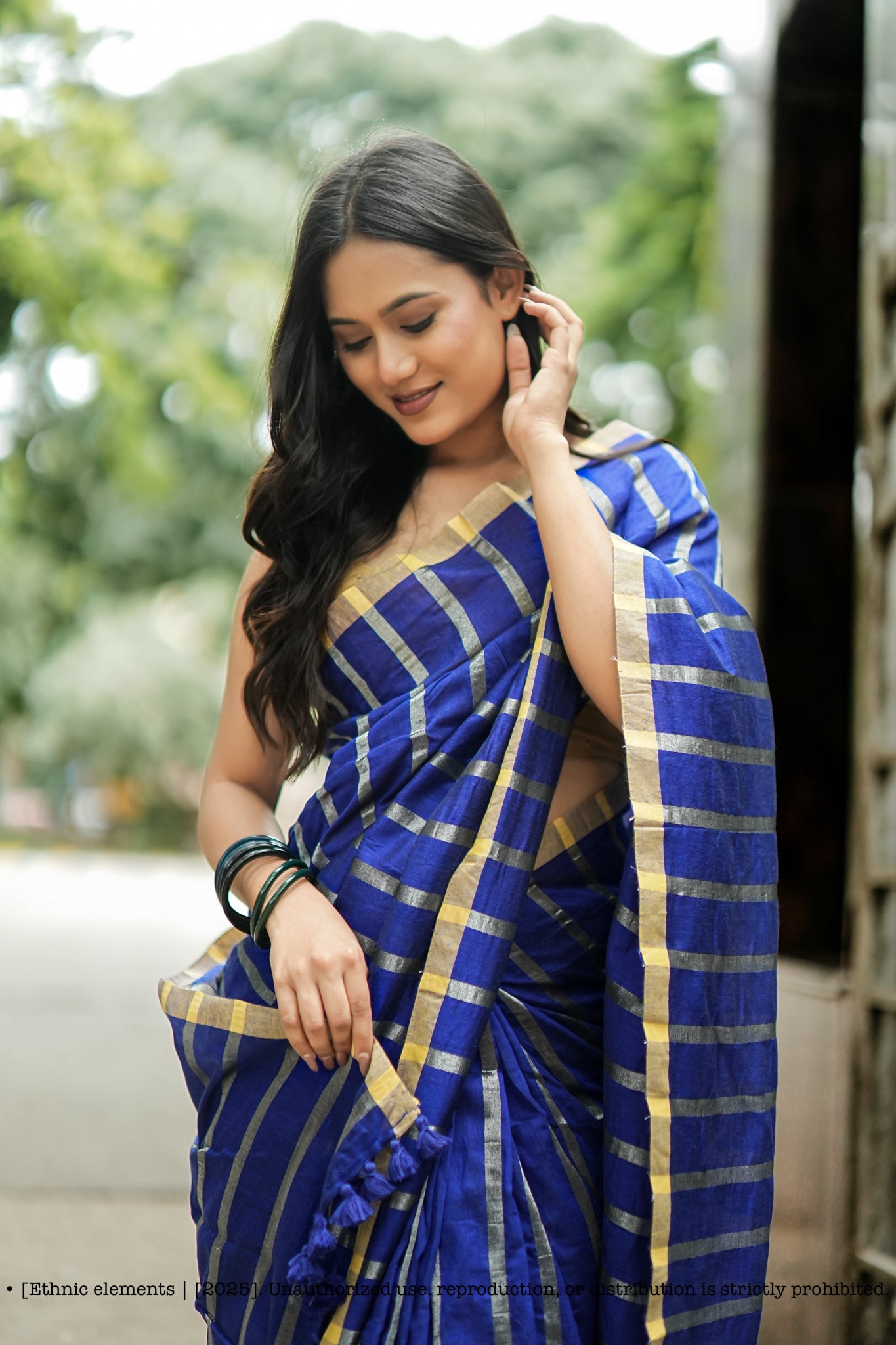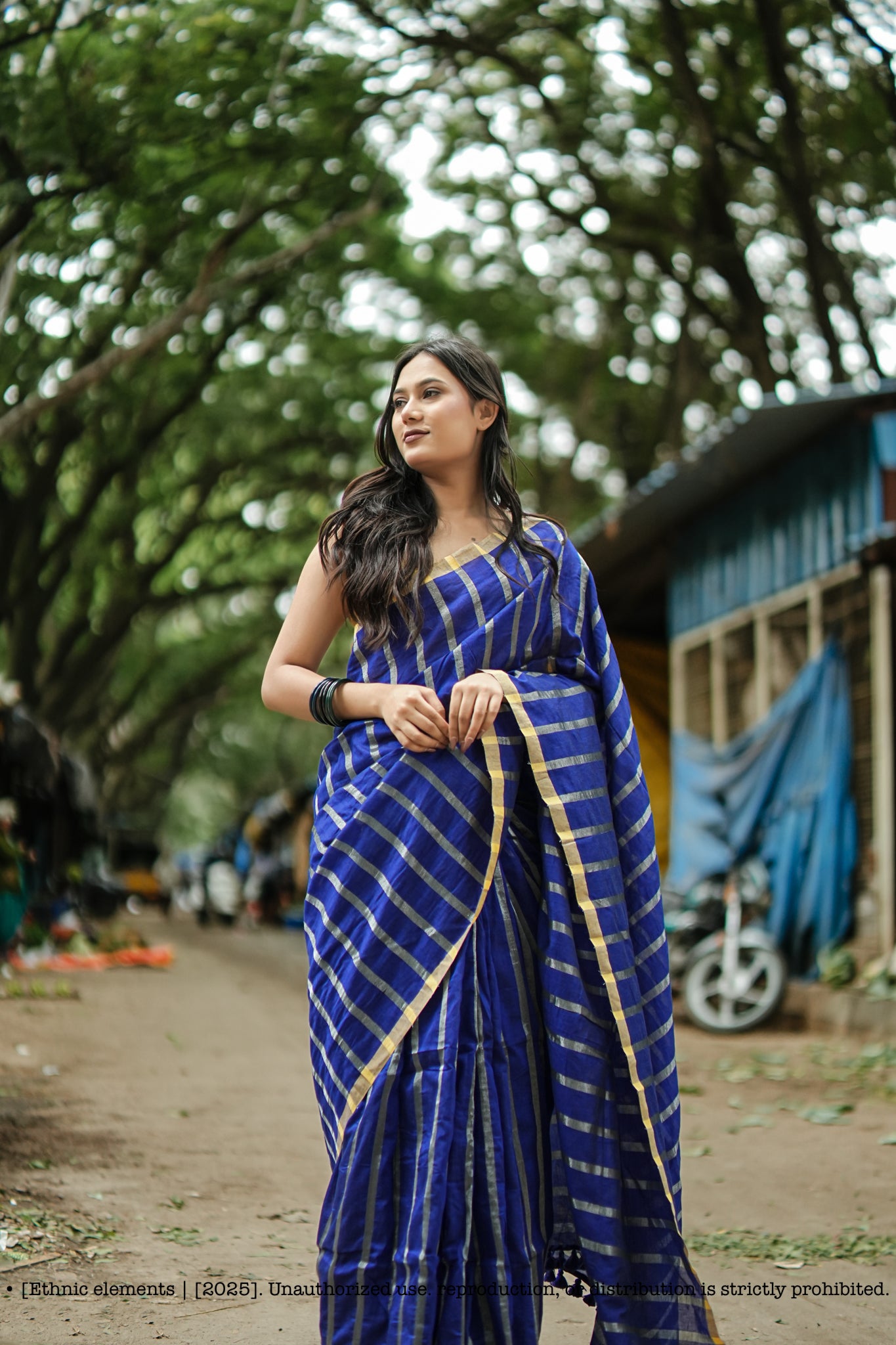 • Design: Deep royal blue base adorned with straight zari stripes throughout; the border and pallu also feature these metallic threads for visual continuity