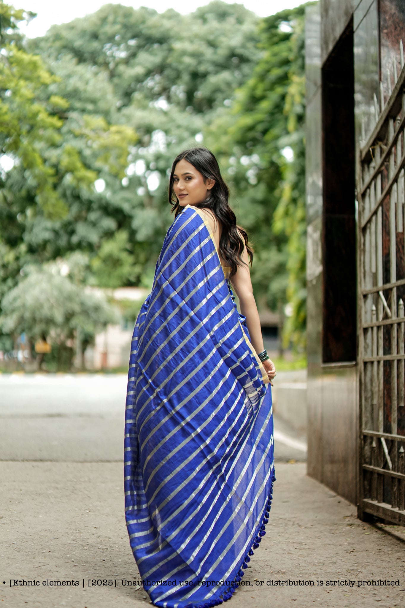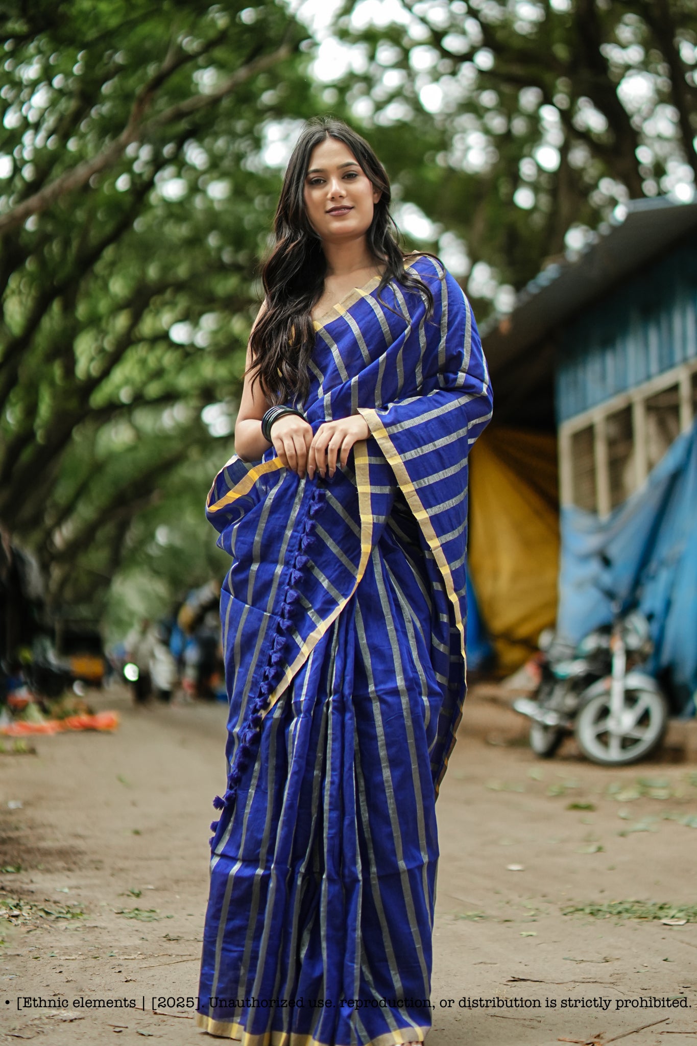 Handloom Mul Cotton Saree Royal Blue - STRIPE SHIMMER
