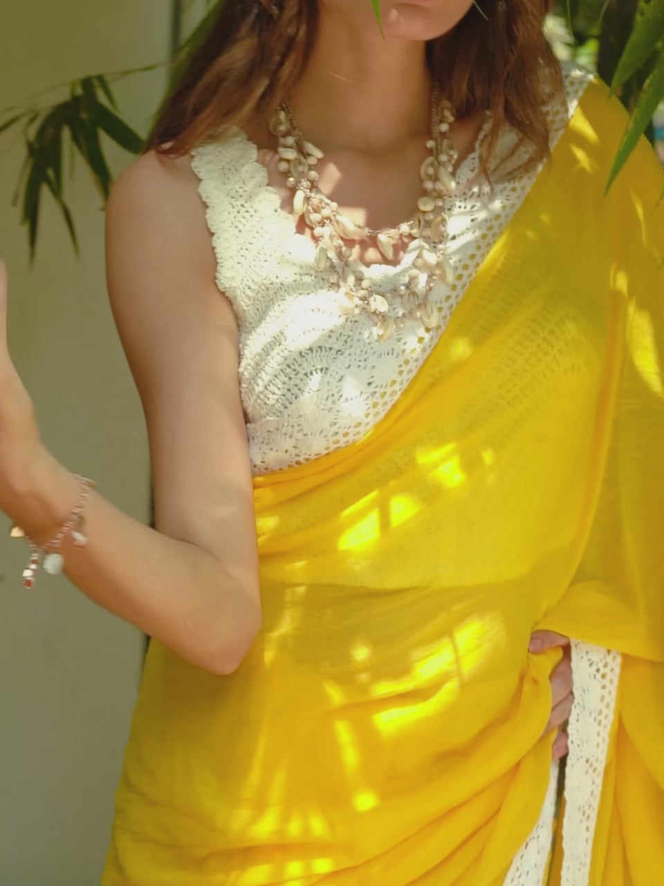 Sunlit Bloom: Yellow Mul Cotton Saree with Crochet Border