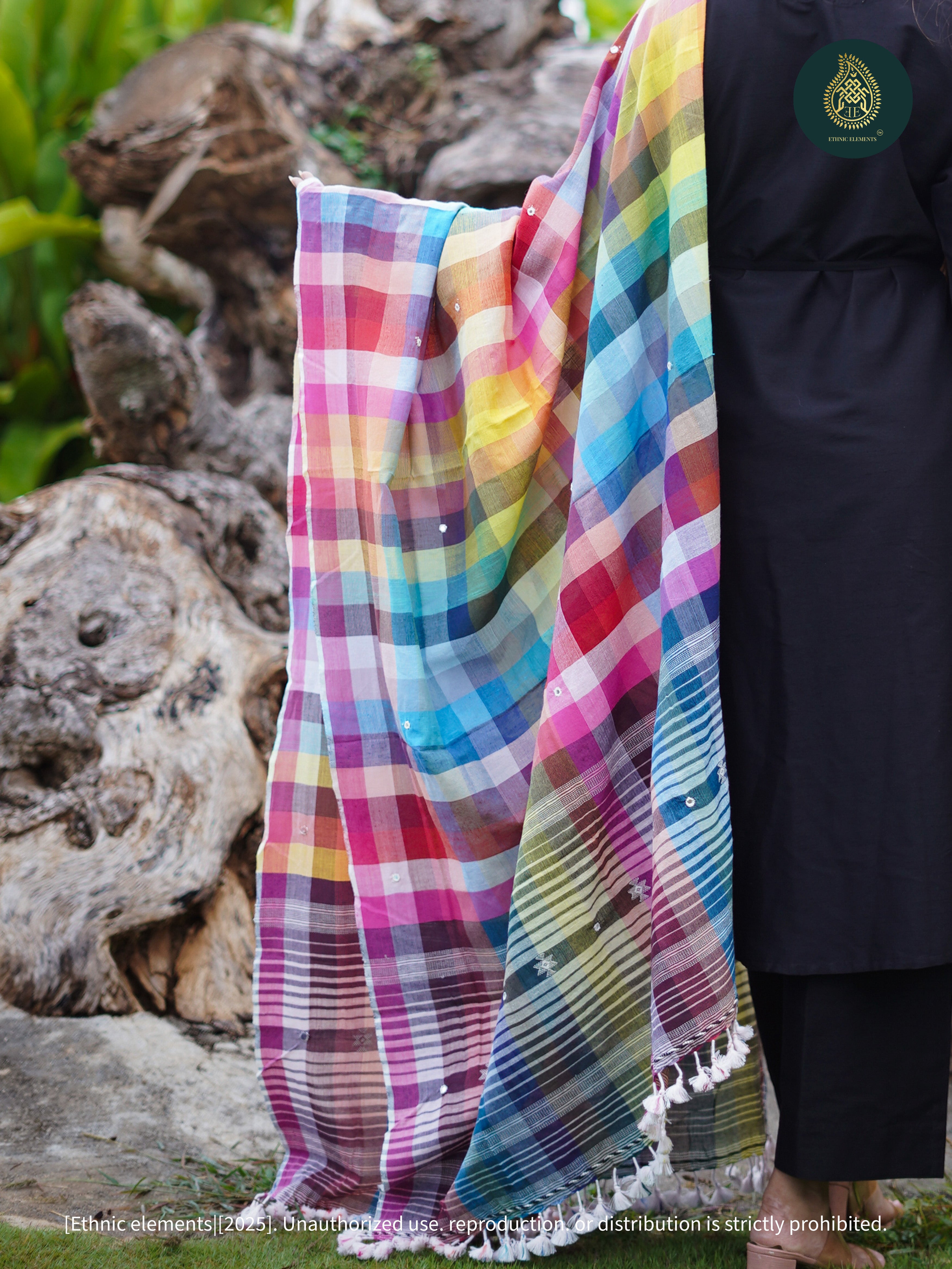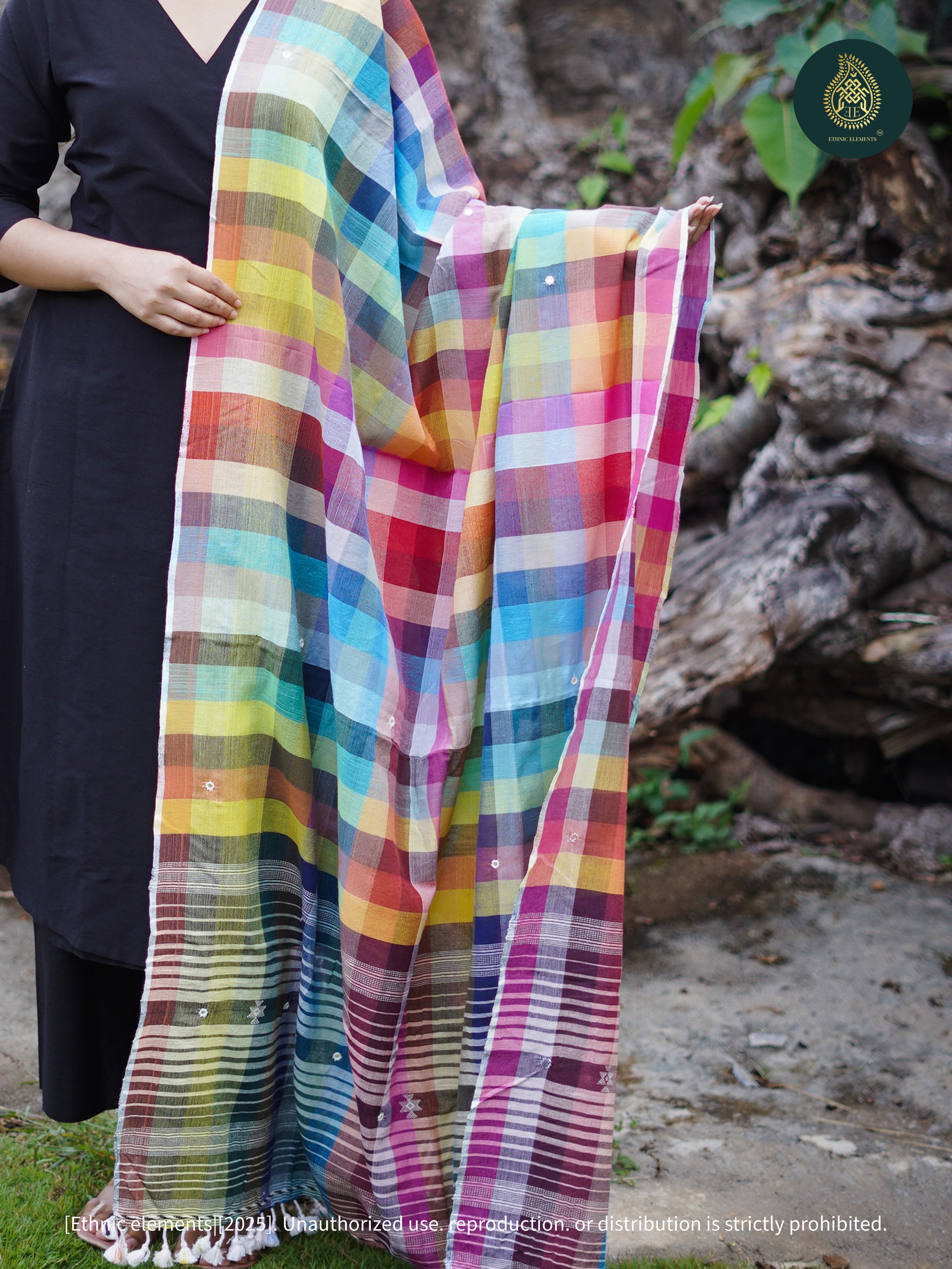 Handwoven in Bhujodi, Kutch, this check kala cotton handloom dupatta is a celebration of centuries-old weaving traditions. Each thread is skillfully interlaced by artisans, creating a timeless check pattern that speaks of patience and craft.