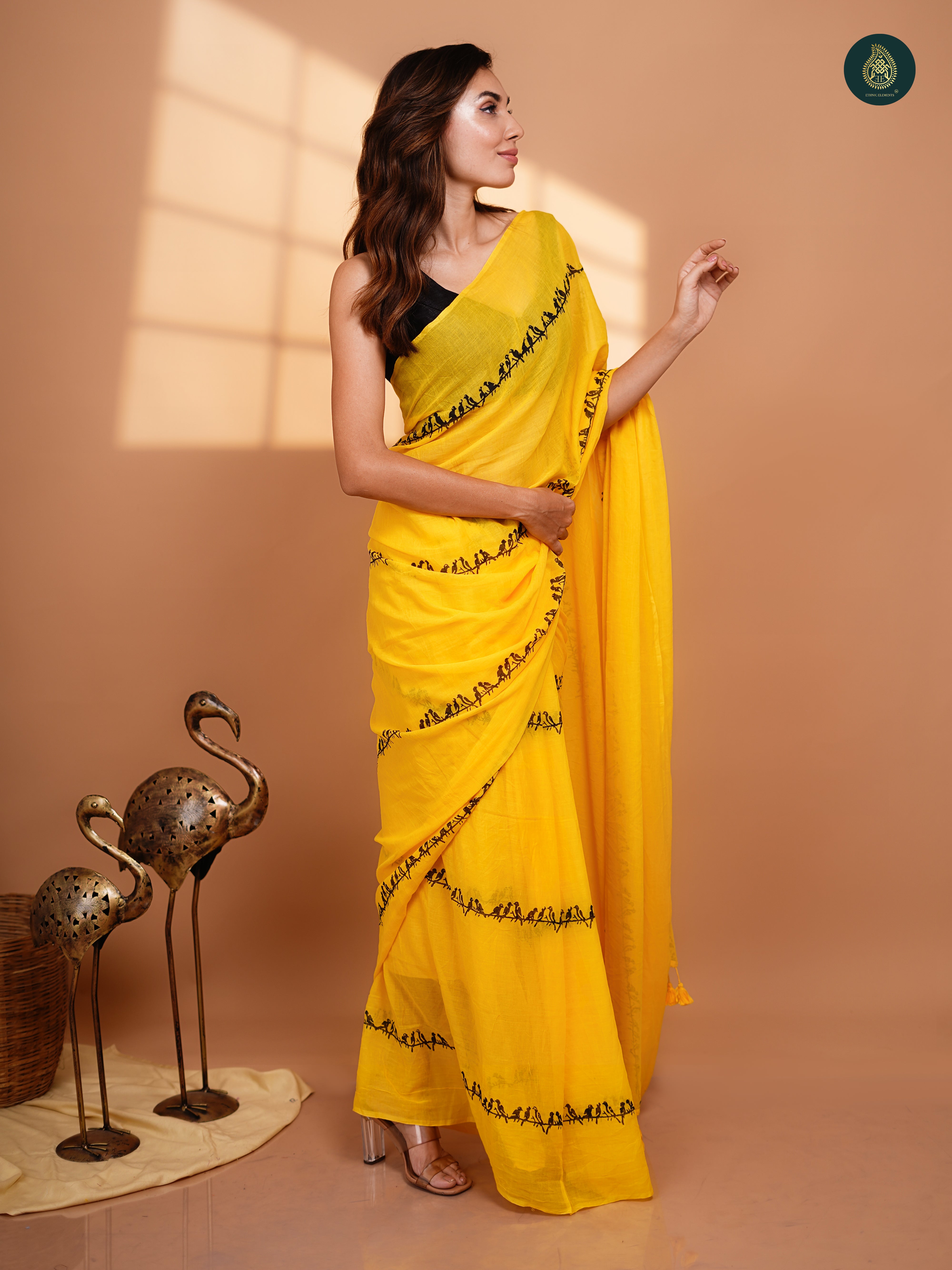 Hand Block Printed Mul Cotton Saree - Yellow Chidiya
