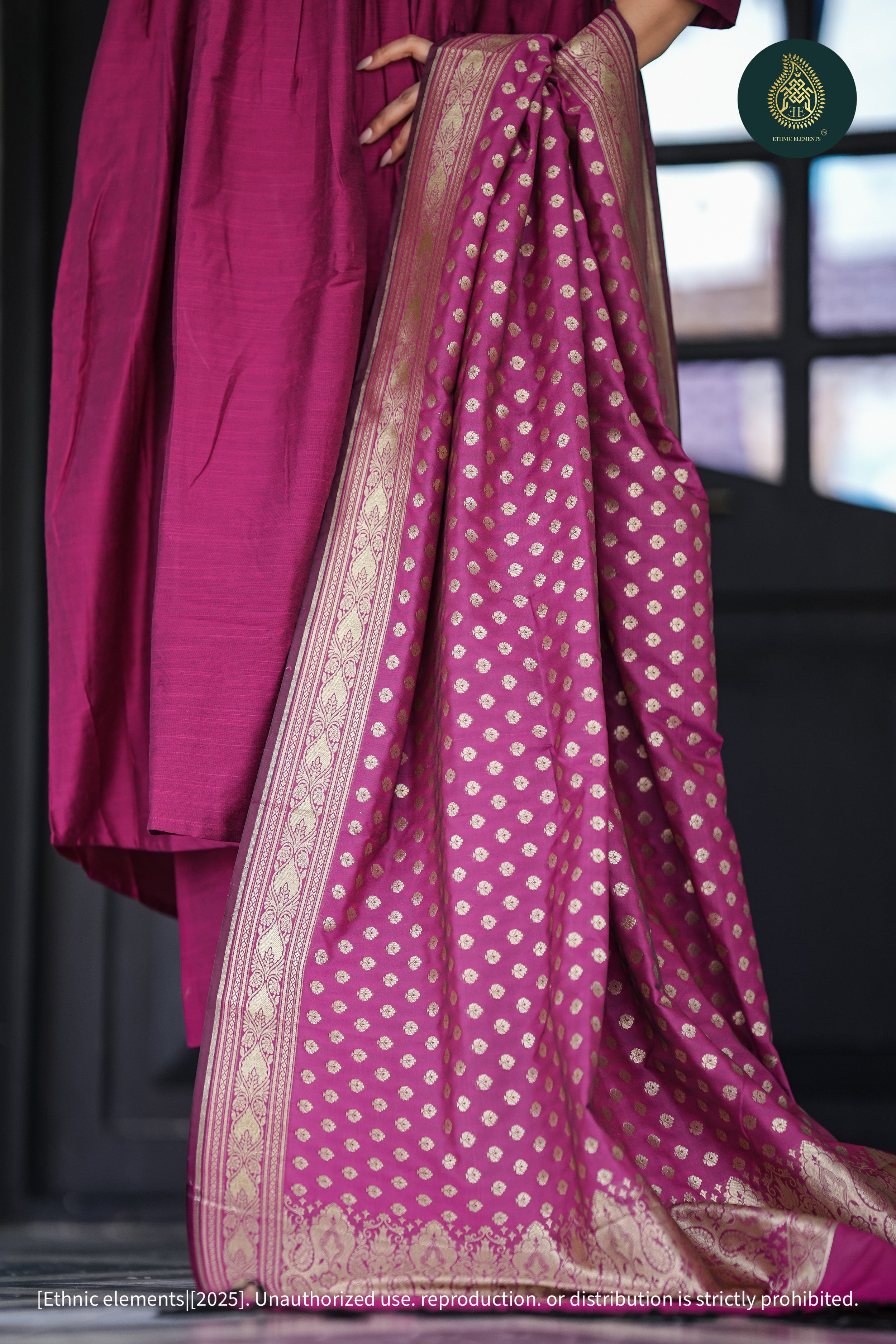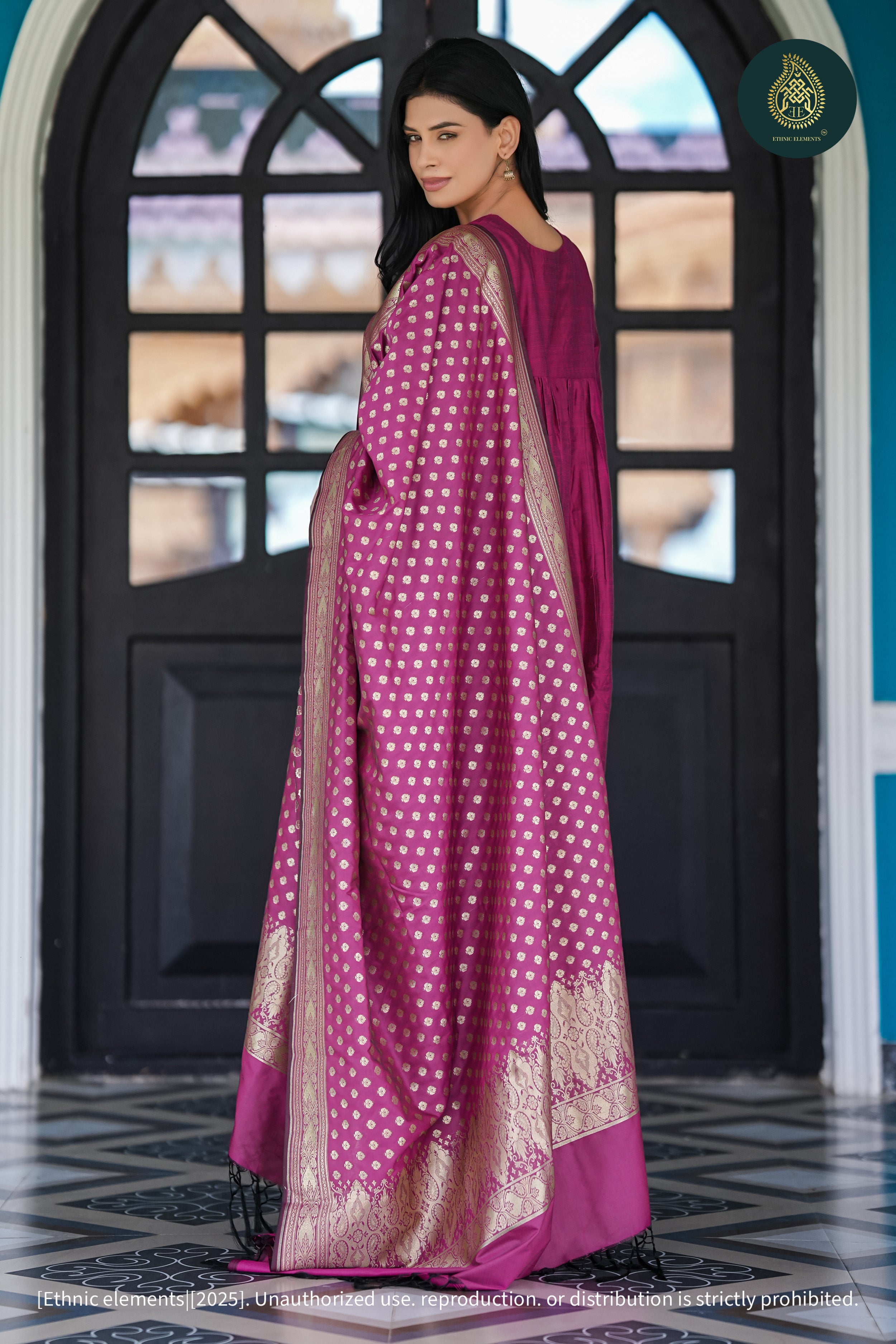 Elegant, bold, and undeniably classic—this Magenta Banarasi zari silk dupatta is crafted to stand out. Rich zari work sits beautifully on the dark base, creating a luxurious contrast that adds instant sophistication to any look. Lightweight, versatile, and stunning in its sheen, it’s a wardrobe essential for festive wear, weddings, or evening celebrations.