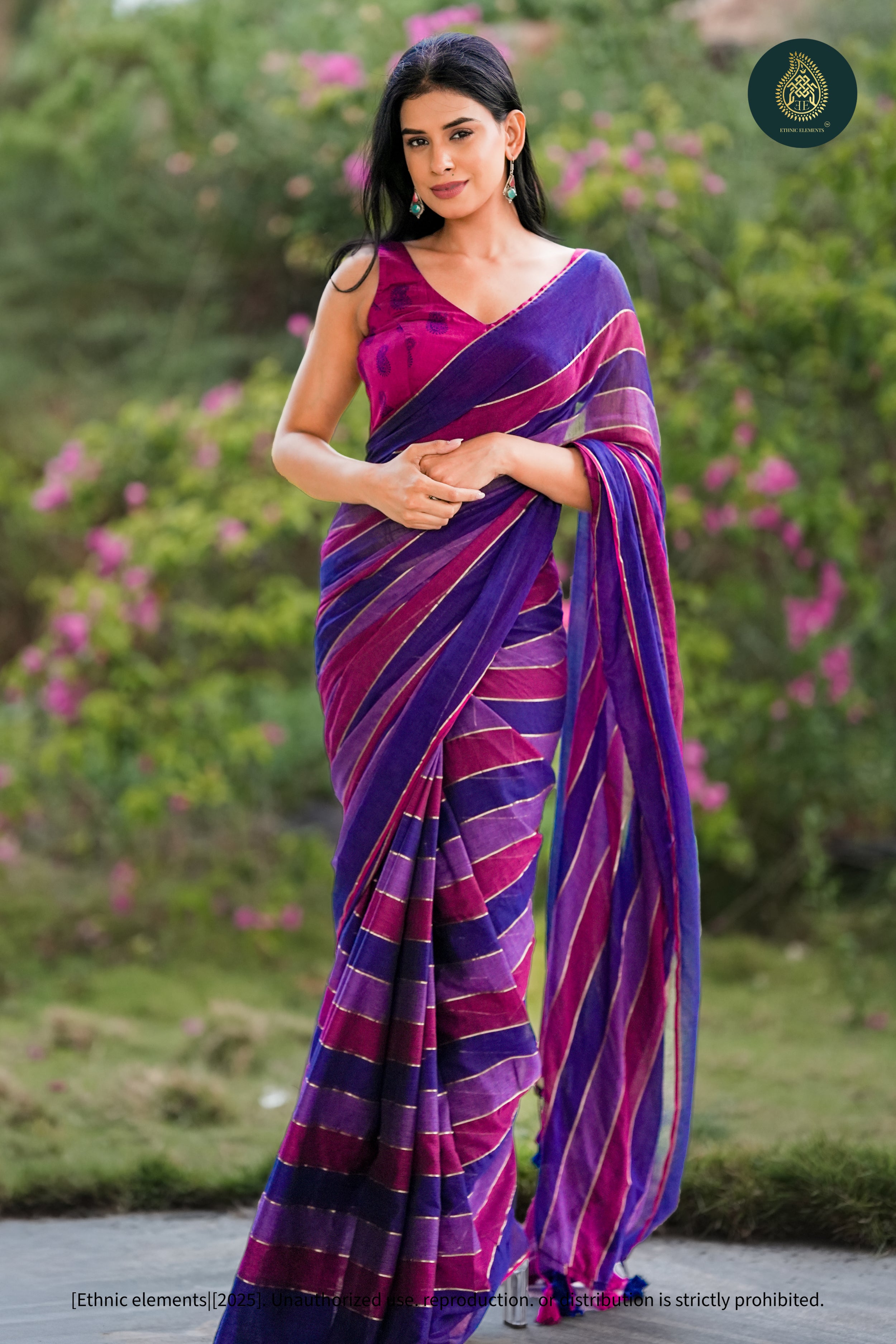 - Color: Purple base with grape-lavender stripes and gold zari lines