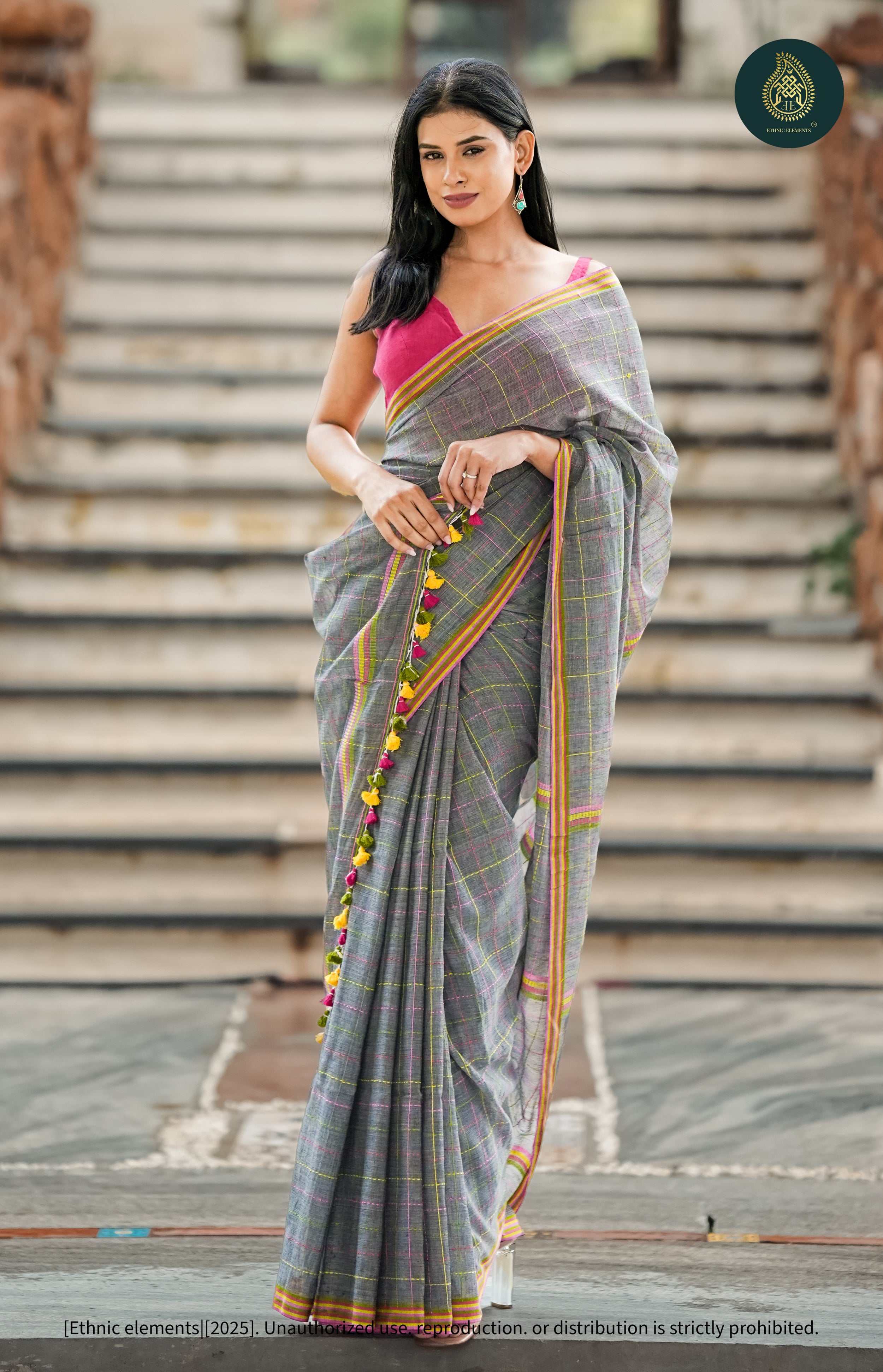 A saree that whispers elegance in every fold this timeless piece comes in a softash-grey tone, adorned with delicateKanthacheck motifs that bring a subtle rhythm to its drape. Minimal yet striking, it beautifully balances tradition with contemporary charm, making it versatile for both festive occasions and everyday sophistication. Pair it with silver jewelry for a refined classic look, or style it with bold accents for a modern twist.