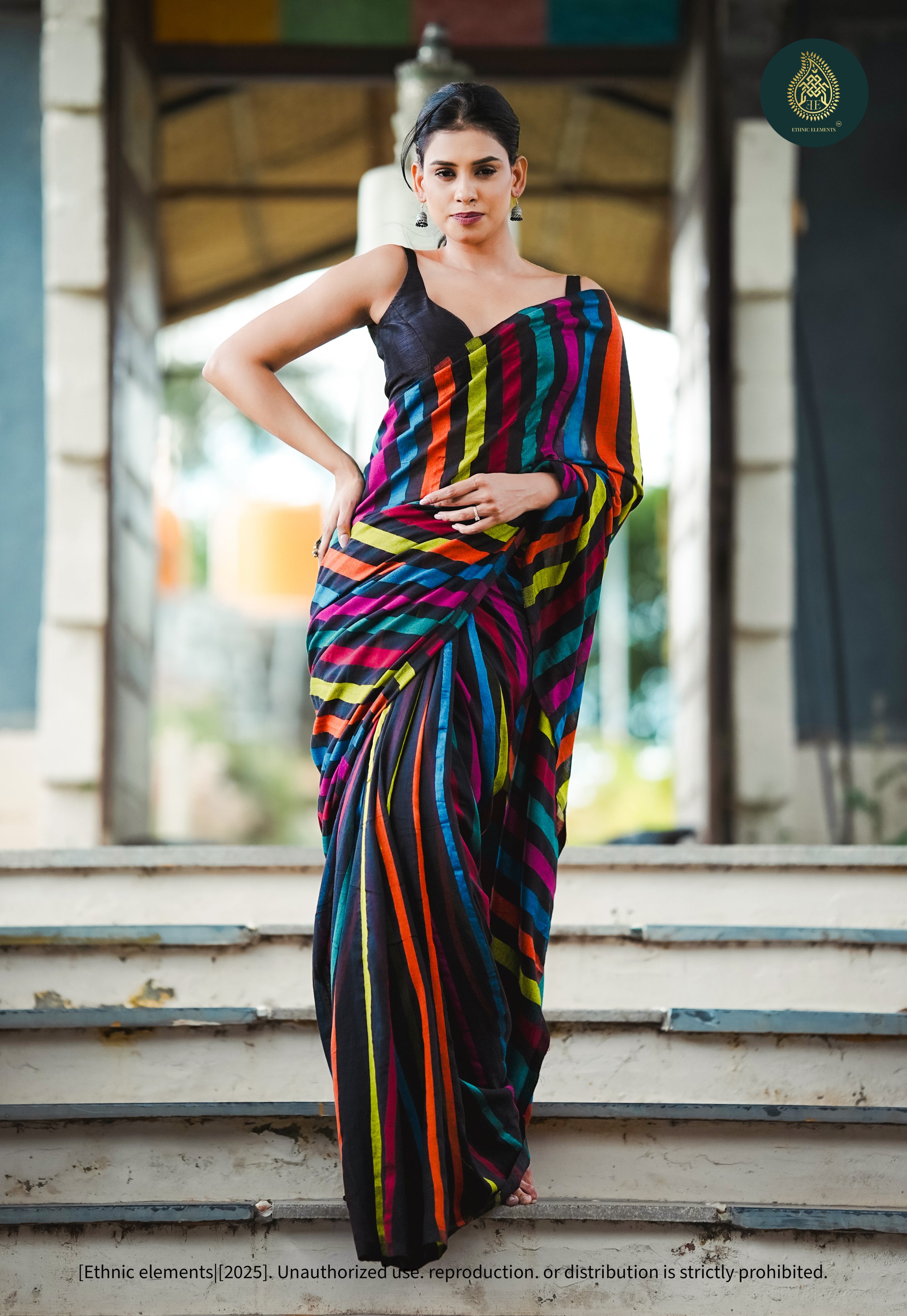 Step into timeless elegance with this striking black saree, elevated by bold, multi-hued stripes that bring vibrance to its classic base. Hand Woven with care, the jewel-toned palette of magenta, orange, teal, and green adds a contemporary flair, making it perfect for both festive occasions and evening gatherings. Lightweight and graceful, this saree blends tradition with modern artistry, ensuring you stand out with confidence and charm.