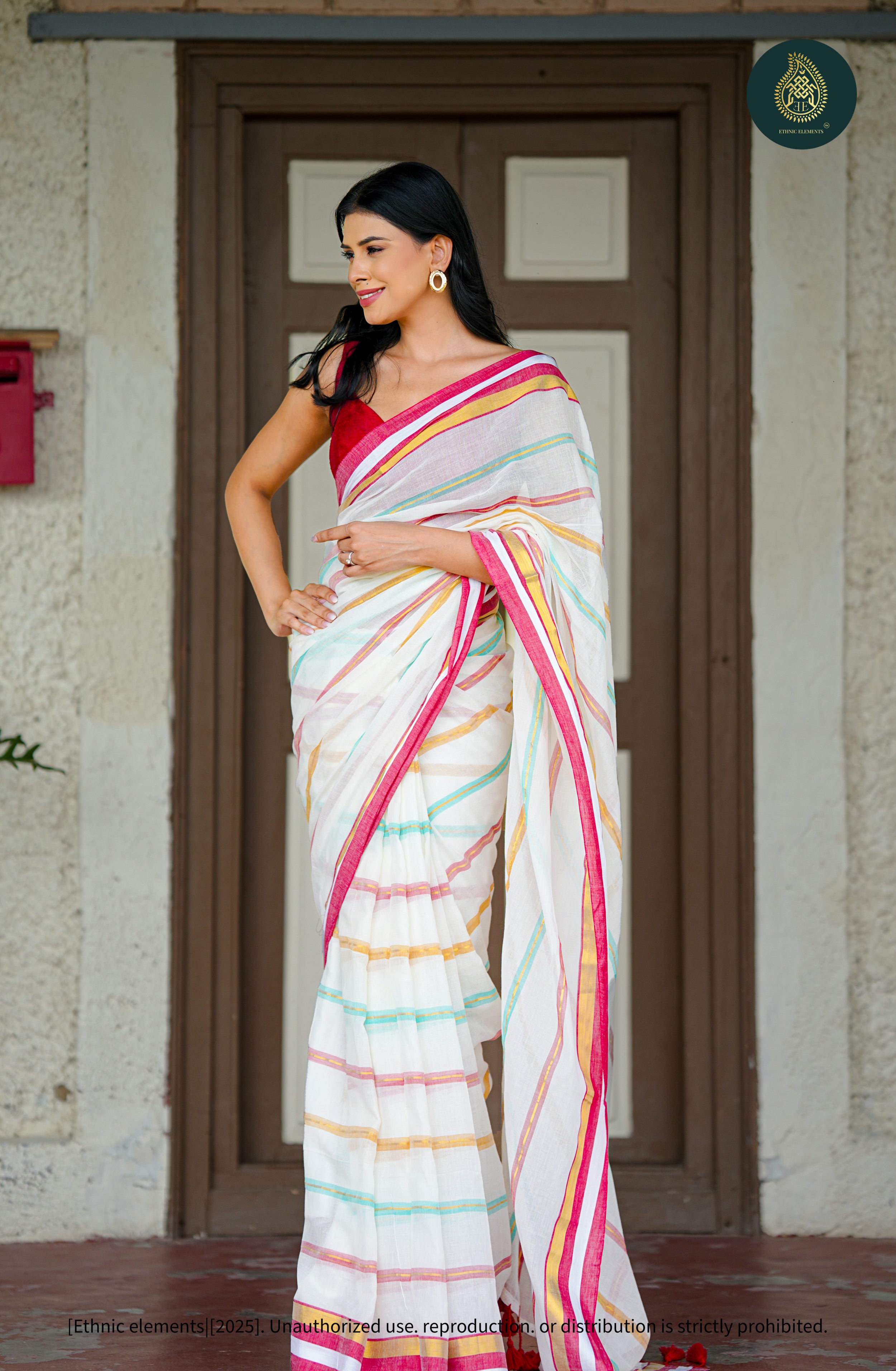 A saree that dances with colors and joy this white drape is adorned with vibrant multicolored stripes with zari work , creating a look that is both playful and refined. The addition of red tassels at the pallu lends a youthful charm, making it perfect for festive celebrations, casual gatherings, or a cheerful day out. Light, breezy, and full of character, this saree embodies effortless elegance with a touch of fun.